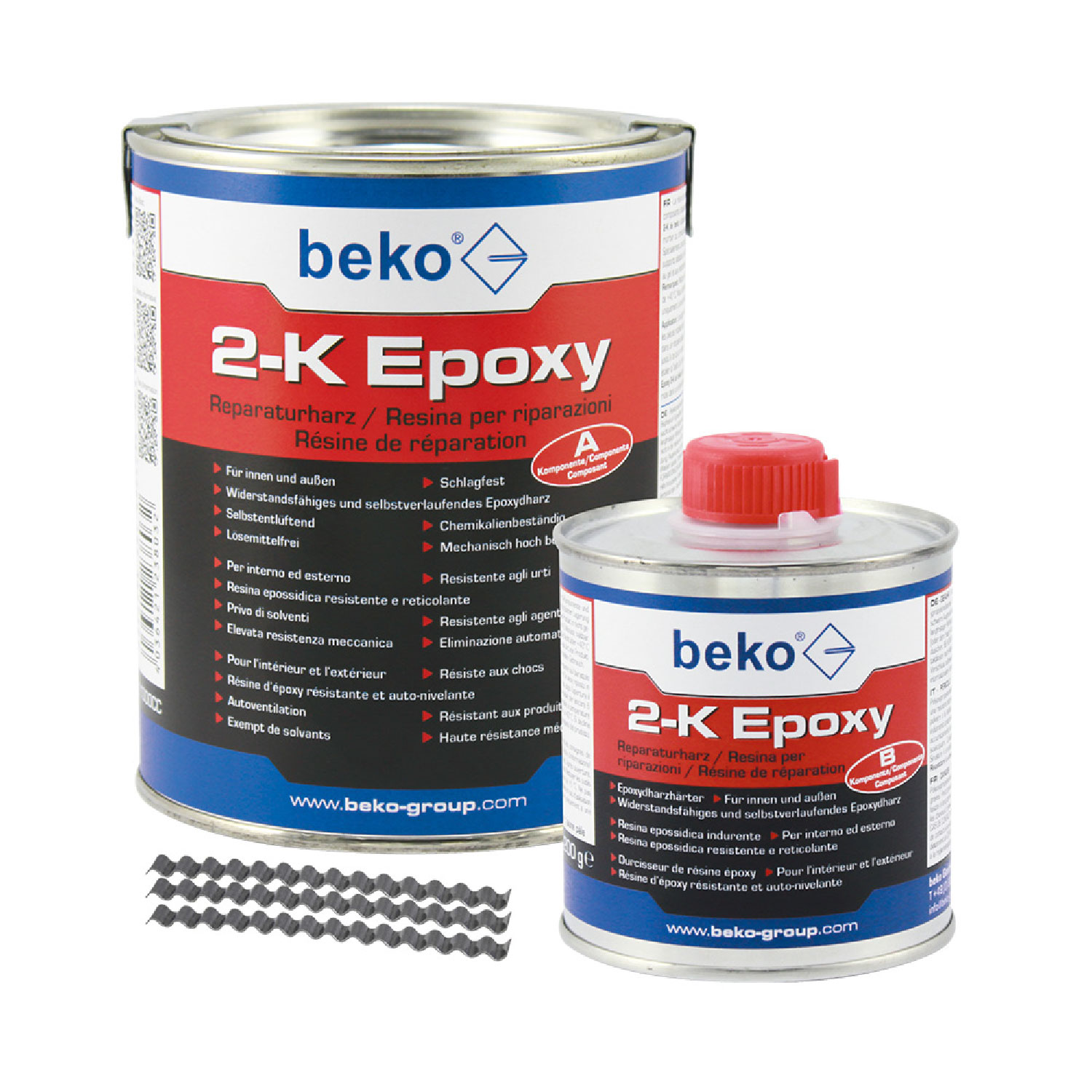 Der Untergrund muss fettfrei, trocken, sauber und haftfähig sein, ggf mit beko Allclean reinigen. Lose Teile und Farbanstriche entfernen. Bei teilweisem Aufbrauchen des Produktes müssen die beiden Komponenten in einem geeigneten Behälter in einem Verhältnis von 4 Anteilen Komponente A und 1 Anteil Komponente B angemischt werden (Verhältnis 4:1). Anschließend verrühren, bis ein schlierenfreier, grauer Mörtel entsteht. beko 2-K Epoxy in die Fugen und Risse gießen und ggf. mit einem Pinsel oder Spachtel verstreichen. Bei Verfüllung an Kanten ist ggf. eine Schalung notwendig. beko 2-K Epoxy ist mit den meisten Lacken überstreichbar. Mindestschichtdicke 5 mm. Werkzeuge mit beko Allclean reinigen.