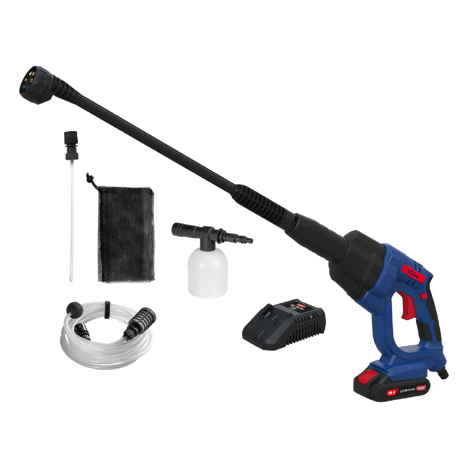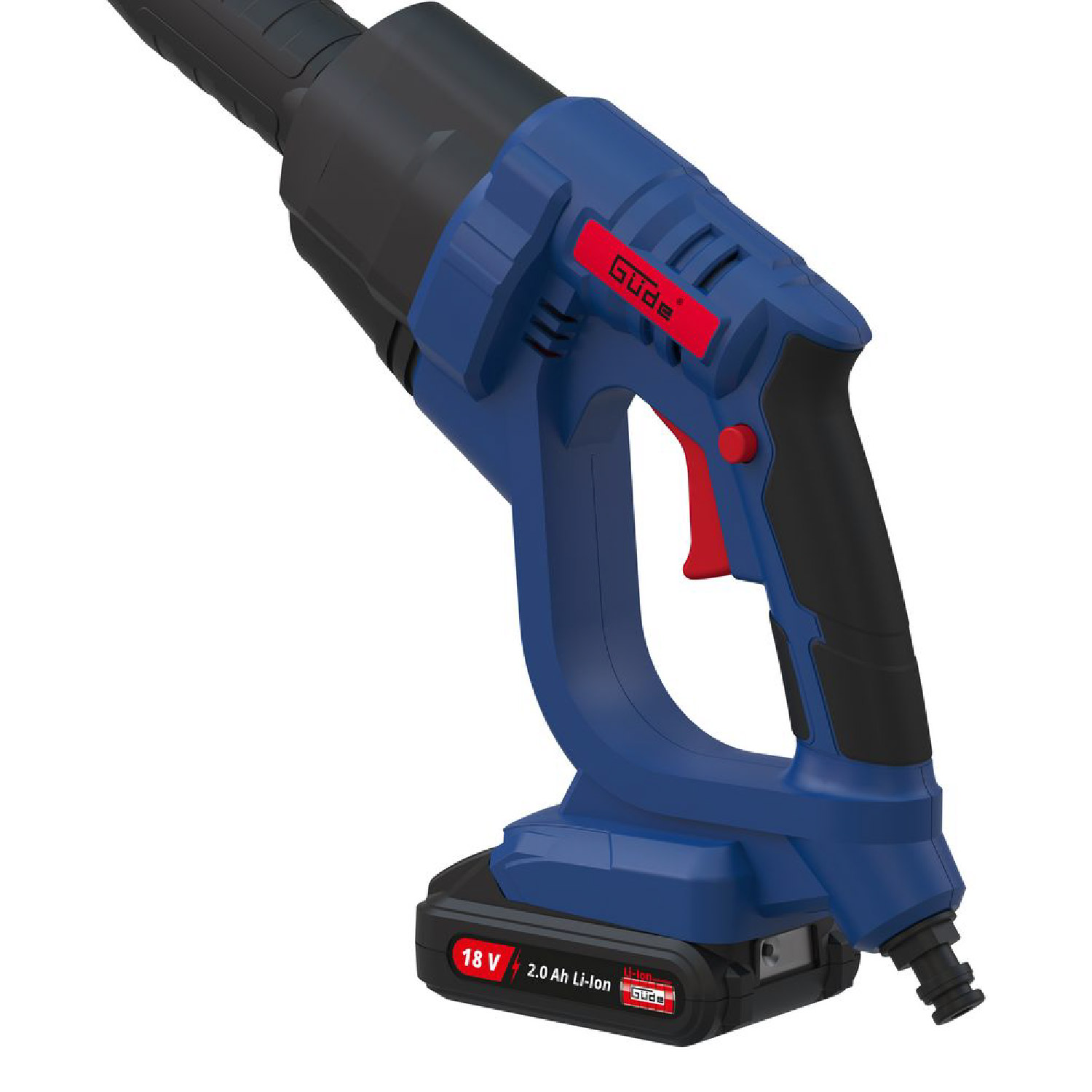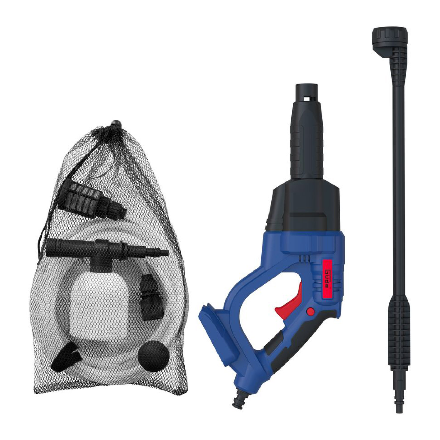 Druckreiniger DR 18-0, Reinigungsmittelflasche, Druckschlauch, Multifunktionsdüse, Beutel, Adapter für PET Flaschen, Akkupack 2 Ah & Ladegerät 2,3 A aus der E³ Akkuserie