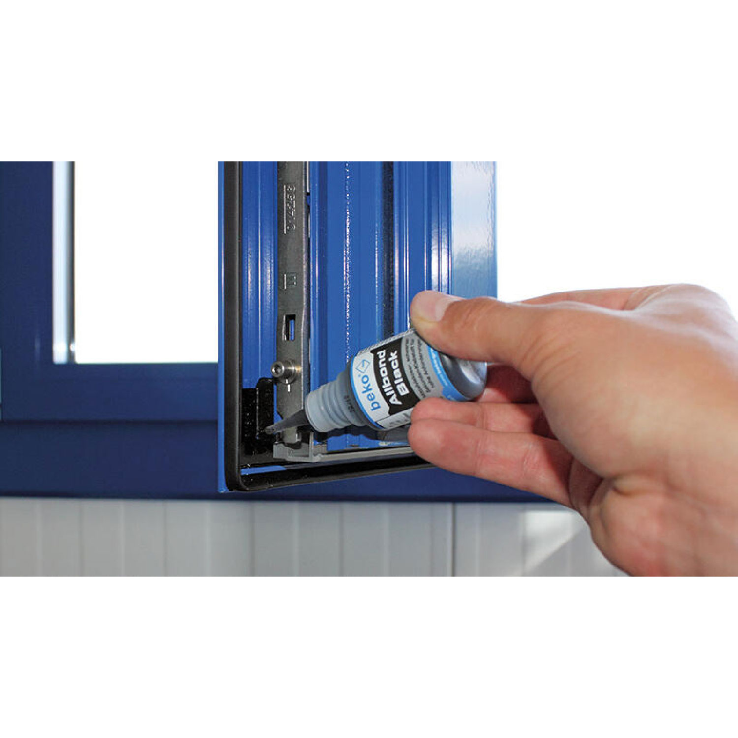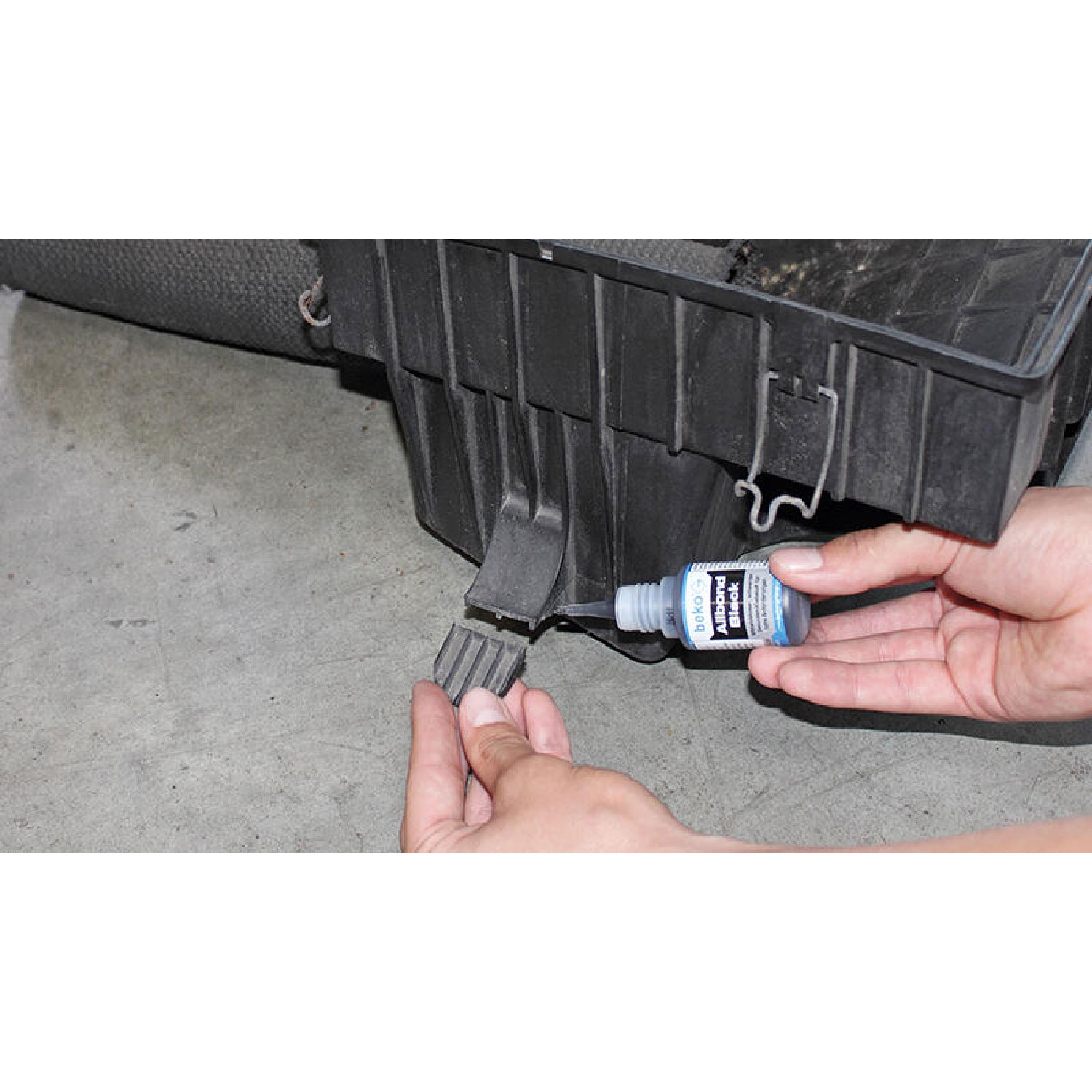 Klebeflächen müssen trocken, sauber, staub-, öl- und fettfrei sein. Fügeteiloberfläche mit beko Allclean reinigen. beko Allbond-Black bei Raumtemperatur in einer dünnen Schicht auf eine der Fügeteiloberflächen auftragen und die zu verklebenden Teile für etwa 10 Sekunden fest zusammenpressen. Nach spätestens 40 Sekunden (je nach Werkstoff) weist die Verklebung Handfestigkeit auf. Die Aushärtung kann mit beko Allbond-Spray beschleunigt werden. beko Allbond-Black wieder gut verschließen und aufrecht lagern. Bei Verklebung von Kunststoffen aus PP und PE wird die Vorbehandlung mit beko Allbond-Primer empfohlen. Bei nicht fach- und sachgerechter Anwendung ist jede Produkthaftung ausgeschlossen. Nur für professionellen oder industriellen Gebrauch.