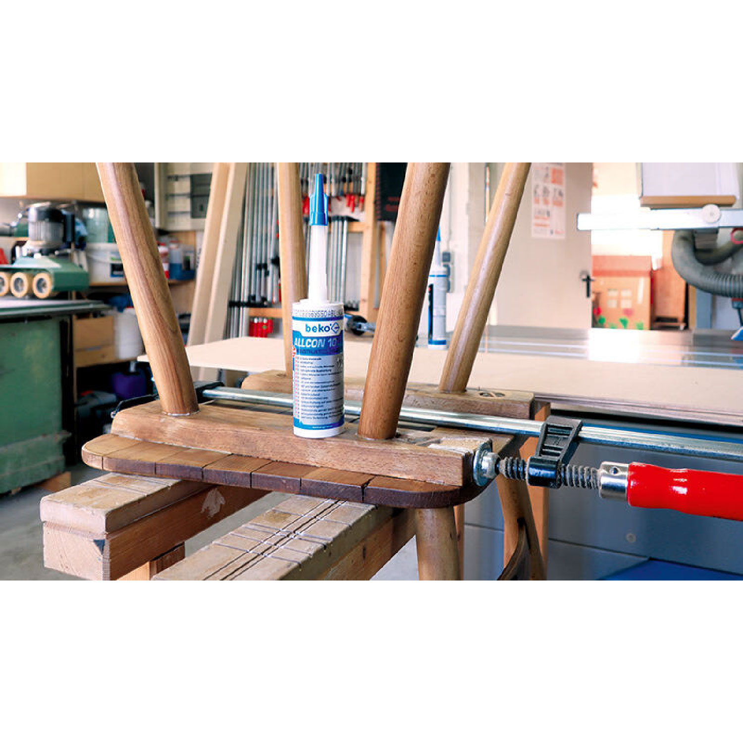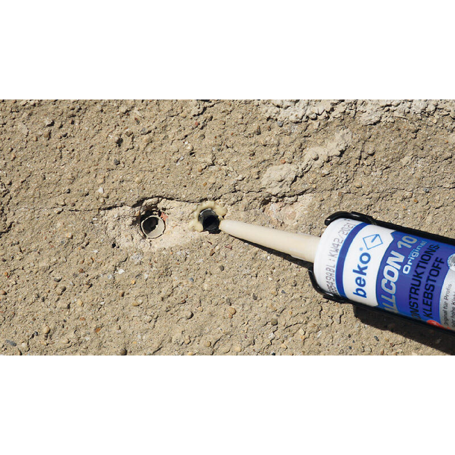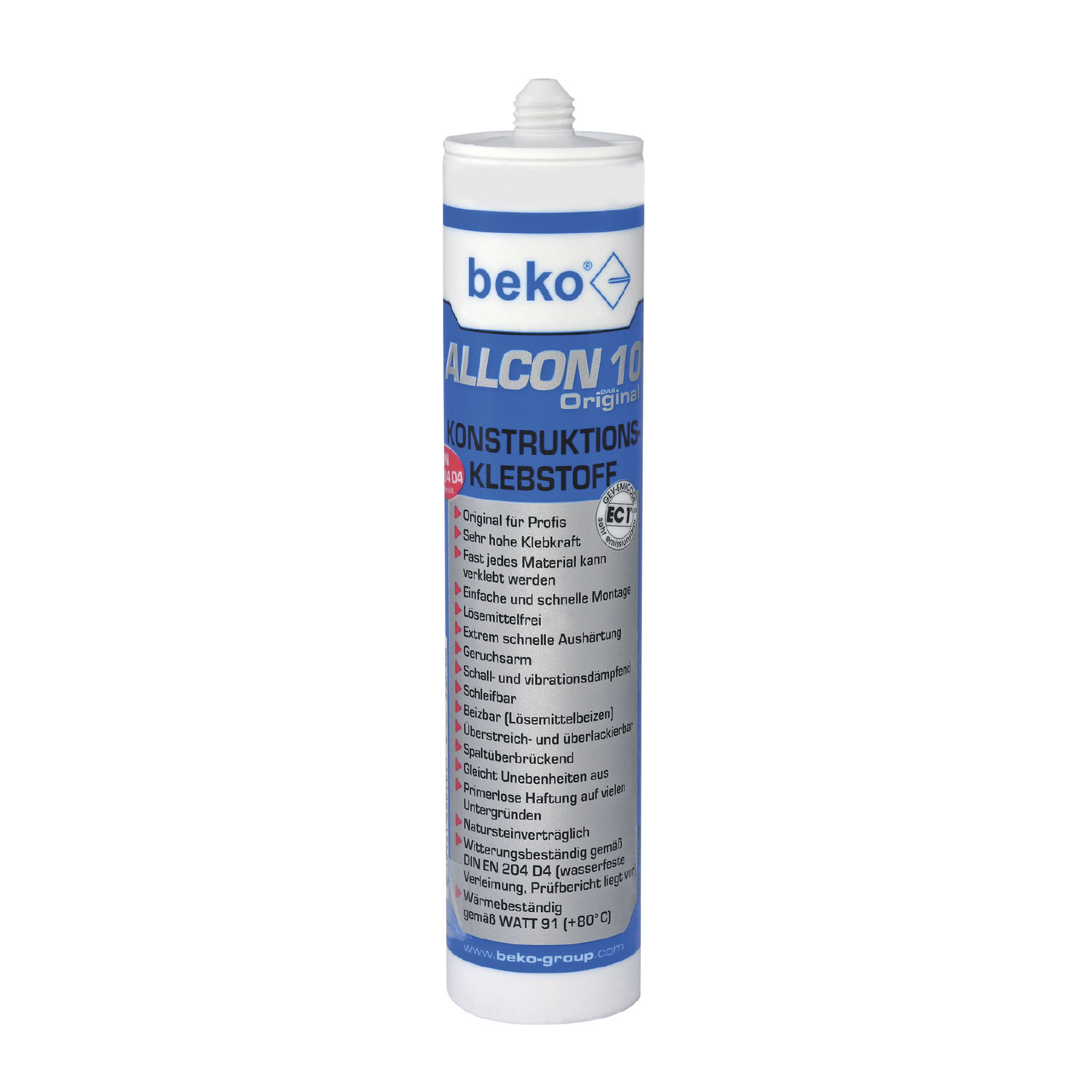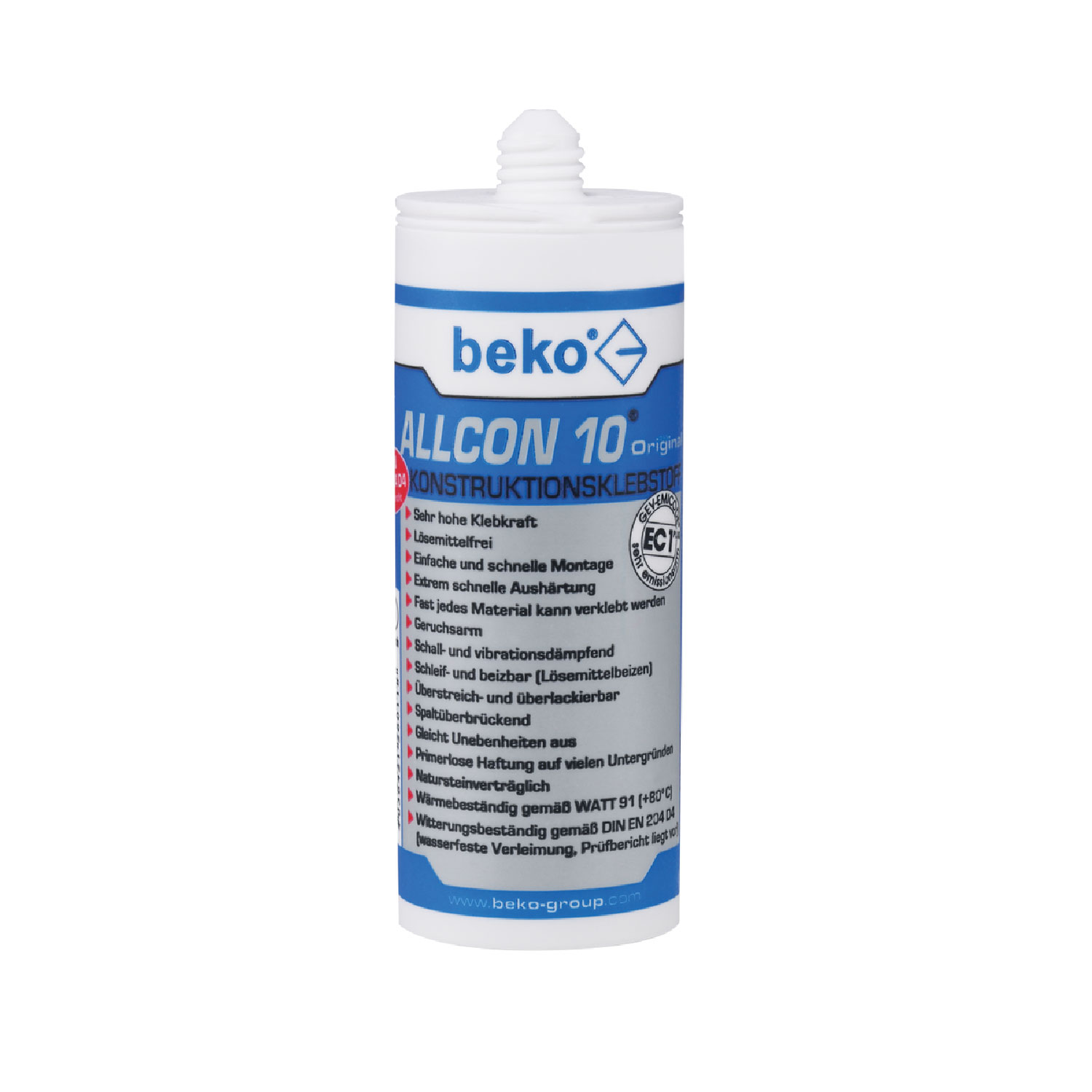 Allcon 10 Konstruktionsklebstoff aus Polyurethan, witterungsbeständig gemäß DIN EN 204 D4, Prüfbericht liegt vor, verbindet nahezu alle Materialien, einkomponentig, einfache Handhabung, ohne Lösemittel, alterungsbeständig, gegen viele Chemikalien beständig, frostsicher, natursteinverträglich, GEV-EMICODE® EC 1Plus – sehr emissionsarm.