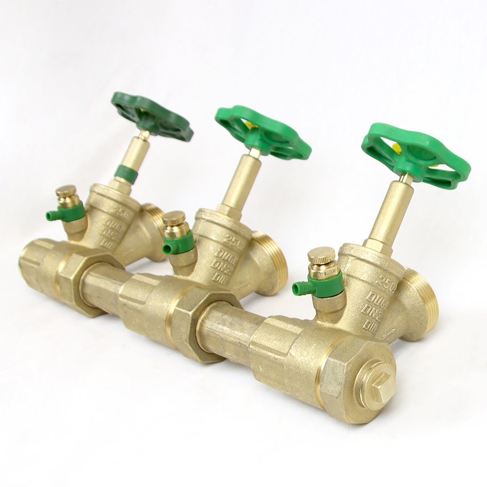 Kompaktverteiler zur individuellen Verteilung von Wasser an verschiedene Verbrauchsstellen mit steigender Spindel und einem kombinierten Freistromventil mit Rückflussverhinderer.