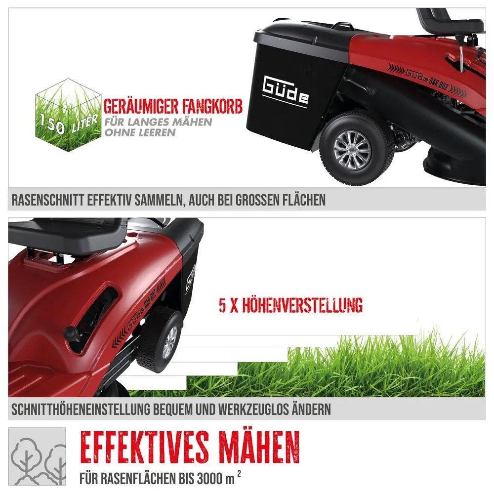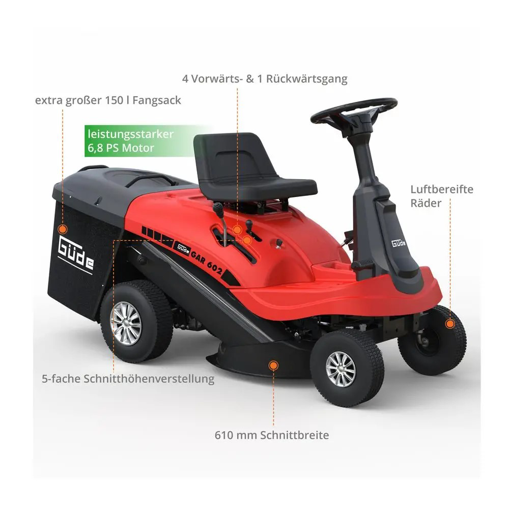Ihr Powerpaket für richtig große Wiesen und Rasenflächen bis 3000 m² - der Güde Aufsitzrasenmäher GAR 602. Sein leistungsstarker und umweltfreundlicher 4-Takt Verbrennungsmotor erfüllt alle geltenden Abgasnormen der EU und leistet dabei satte 6,8 PS. Mit der 5-Gang Schaltung entscheiden Sie ganz einfach selbst über Ihr individuelles Mähtempo. Aufsitzen, Schlüssel drehen und schon kann es los gehen - dank des komfortablen Elektrostarts. Ein Hebel ermöglicht Ihnen die Wahl zwischen 5 verschiedenen Schnitthöhen - ohne dabei vom Gerät absitzen zu müssen. Der große Auffangsack mit 150 Litern Fassungsvermögen ermöglicht Ihnen auch bei der großen Schnittbreite von 61 cm eine lange Mähzeit. Ausgestattet mit Luftbereifung sowie Fuß-und Parkbremse wird bereitet auch schwergängigeres mit diesem Aufsitzrasenmäher keinerlei Schwierigkeiten.