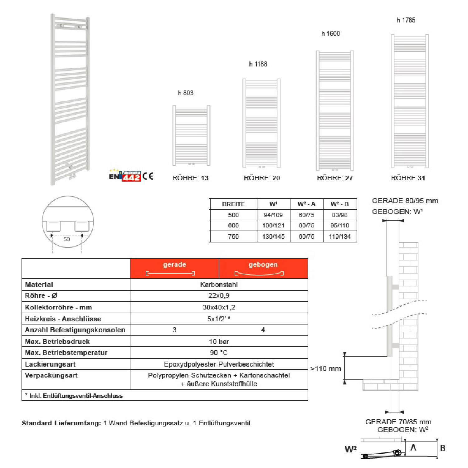 Lieferumfang: 1x Stabilo-Sanitaer Stahl-Badheizkörper Gerade Ausführung, 1x Wand-Befestigungssatz, 1x Entlüftungsventil