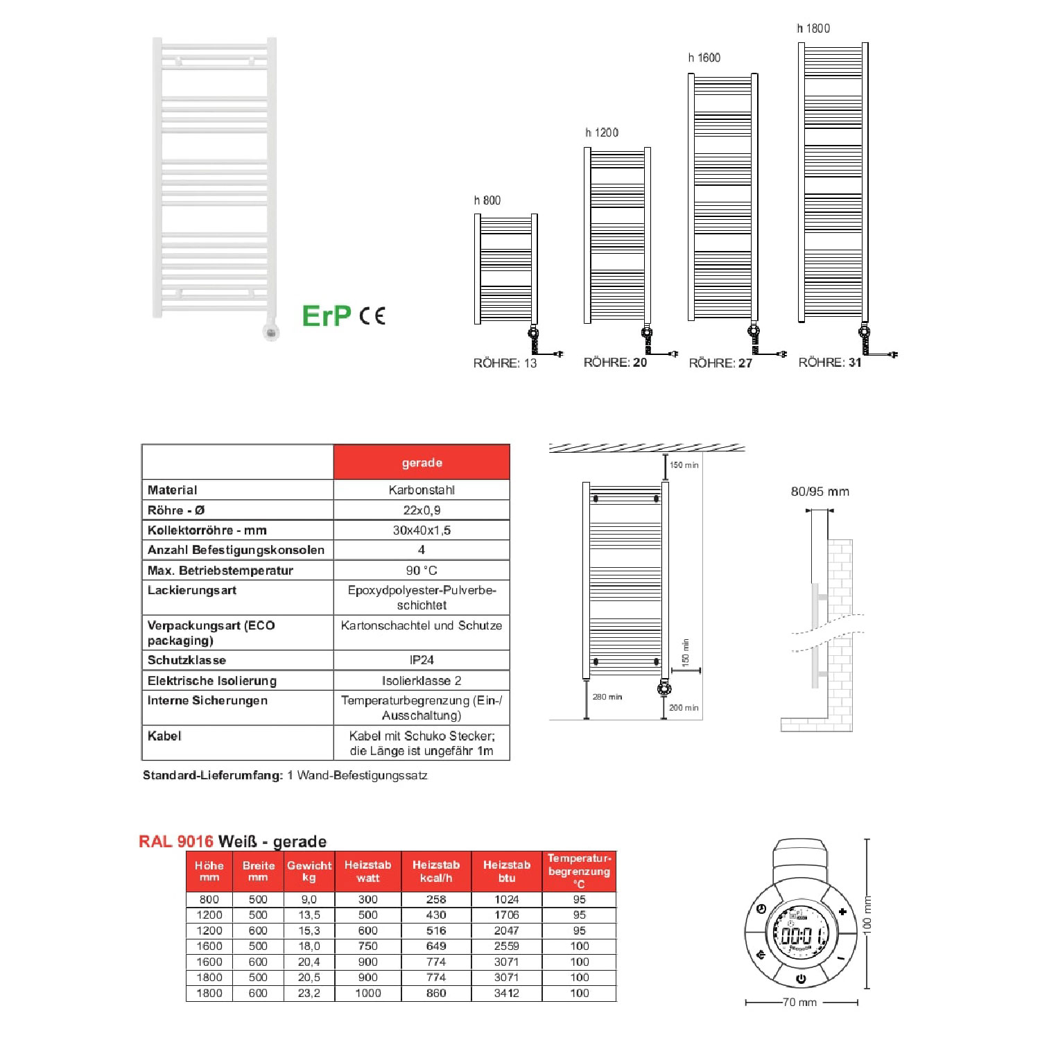 Lieferumfang: 1x Stabilo-Sanitaer Stahl-Badheizkörper Elektro Gerade Ausführung, 1x Wand-Befestigungssatz, 1x Digital-Raumthermostat Heizstab