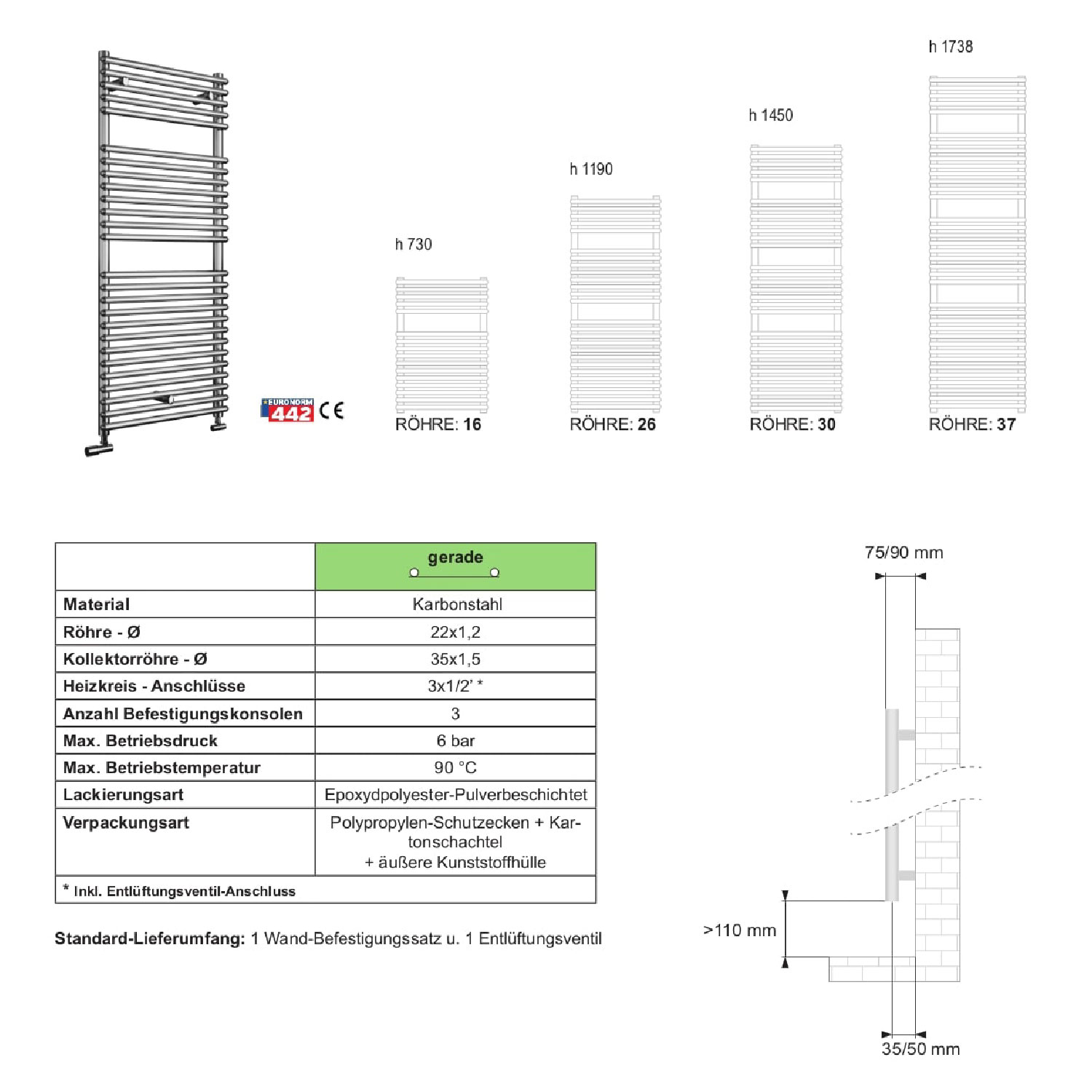 Stahl-Badheizkörper Gerade Ausführung mit seitlichen Kollektorröhren Ø 35 mm und horizontal Rundrohr Ø 22 mm. Mittelanschluss mit 50 mm.