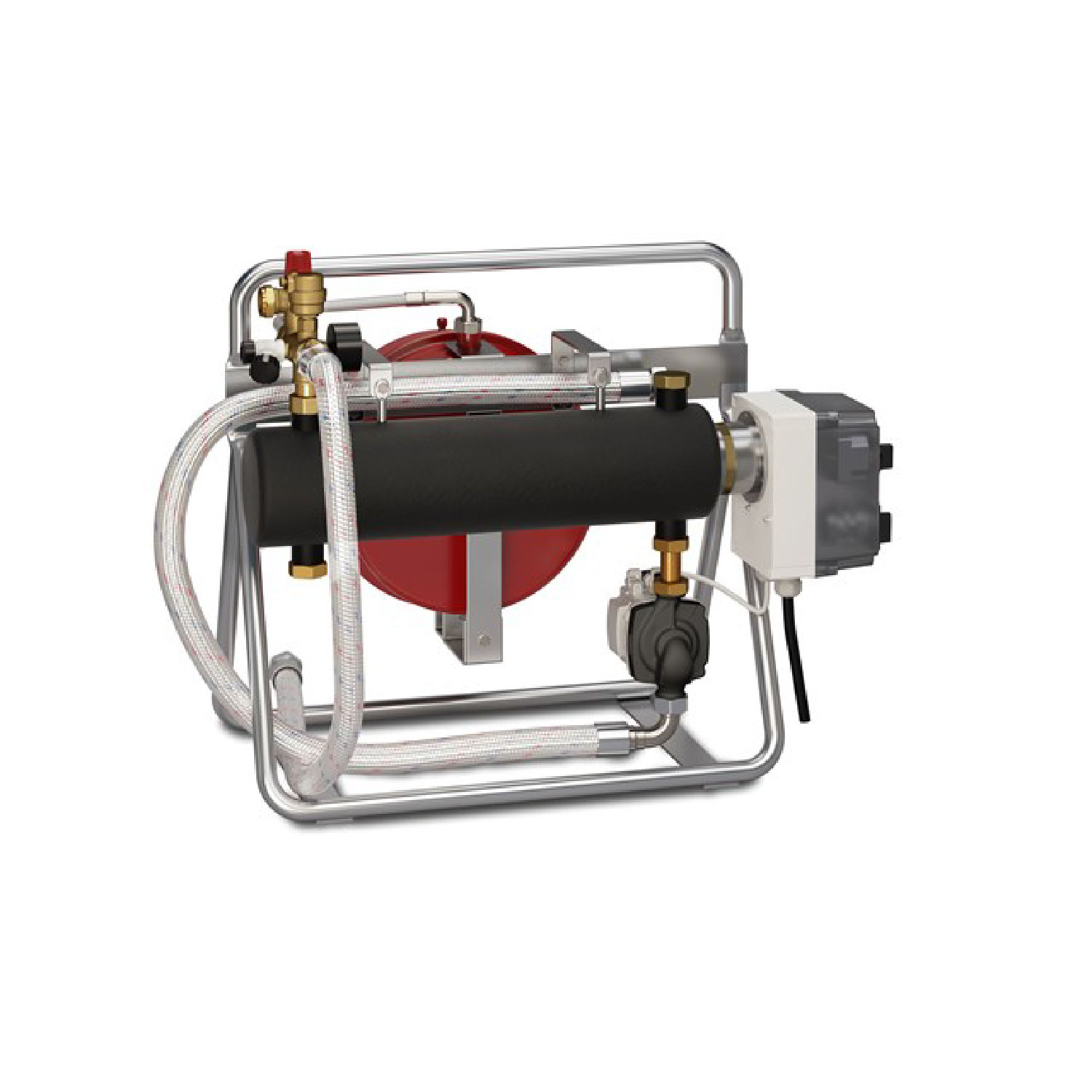 Die Lieferung umfasst alle nötigen Komponenten, einschließlich Umwälzpumpe, Ausdehnungsgefäß und Armaturen mit Sicherheits- und Entlüftungsventil. Der Anschluss an den Heizkreisverteiler bzw. am Heizsystem erfolgt einfach mit einem flexiblen, Stahl umflochtenen Schlauch 1”. Ein Thermostat regelt die Temperatur.