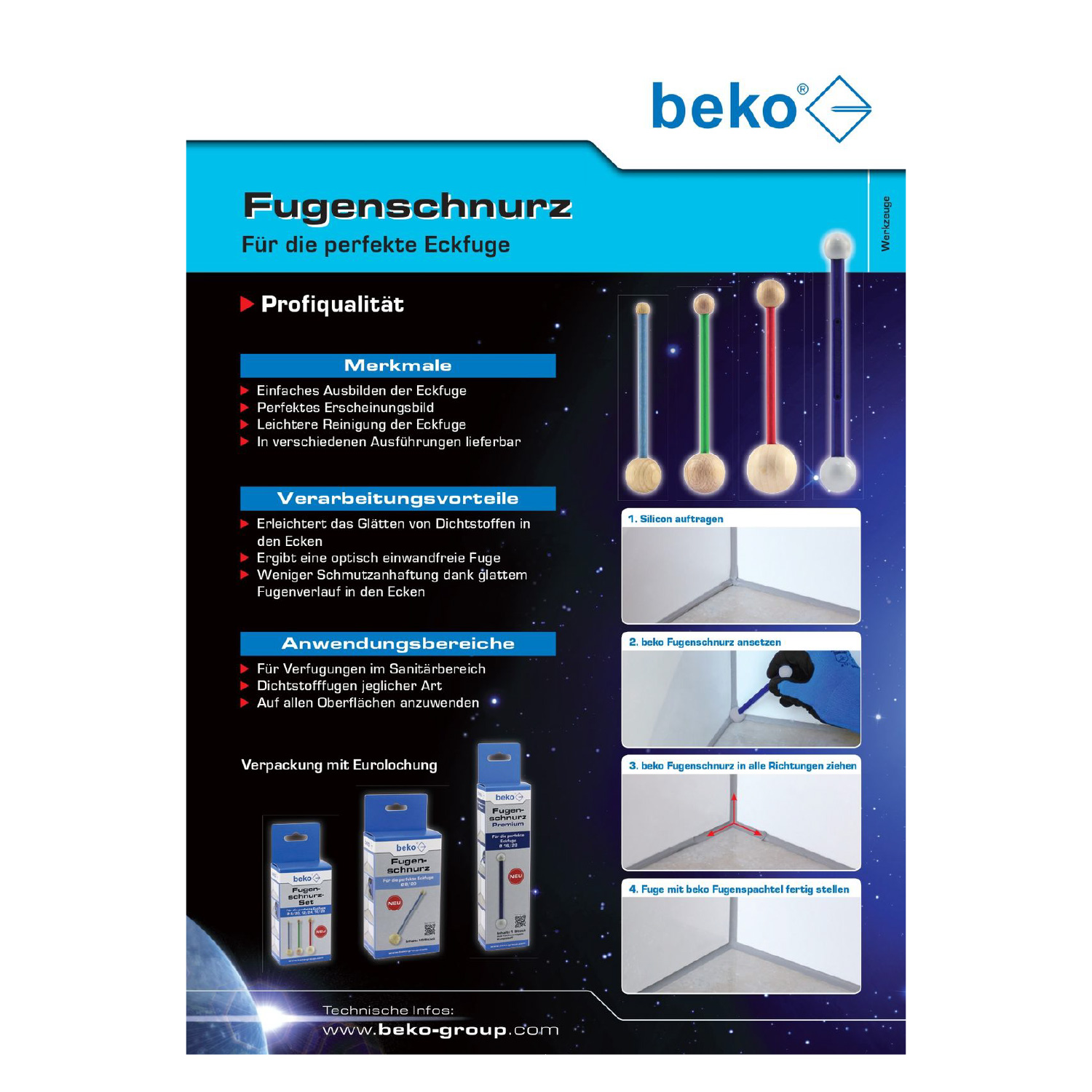 Erleichtert das Glätten von Dichtstoffen in den Ecken, ergibt eine optisch einwandfreie Fuge, weniger Schmutzanhaftung dank glattem Fugenverlauf in den Ecken