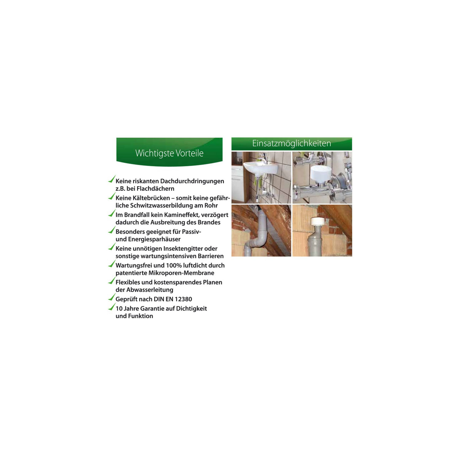 Wartungsfreie Durgo Belüftungsventile aus schlagfestem ABS Kunststoff zum Einbau innerhalb von Gebäuden. Freier Lufteinlass ohne Siebe oder Gitter durch eine dauerelastische Mikroporen-Membran. Abnehmbare Frostschutzhaube bei DN50, DN75 und DN100. Geprüft und zugelassen nach DIN EN 12 380.