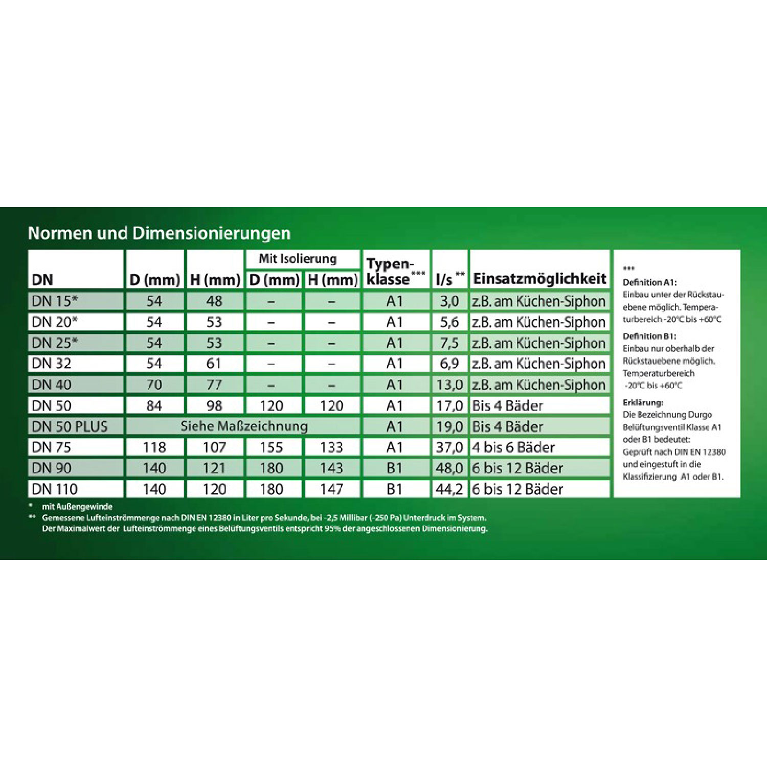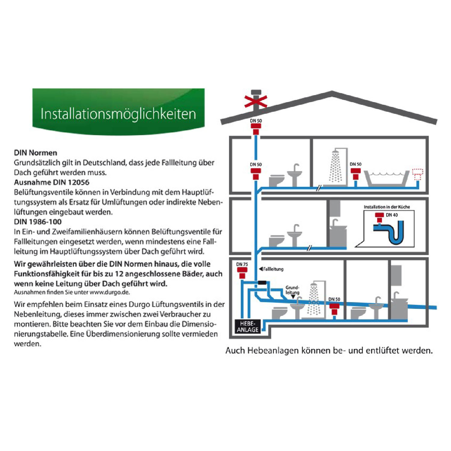 Wartungsfreie Durgo Belüftungsventile aus schlagfestem ABS Kunststoff zum Einbau innerhalb von Gebäuden. Freier Lufteinlass ohne Siebe oder Gitter durch eine dauerelastische Mikroporen-Membran. Abnehmbare Frostschutzhaube bei DN50, DN75 und DN100. Geprüft und zugelassen nach DIN EN 12 380.