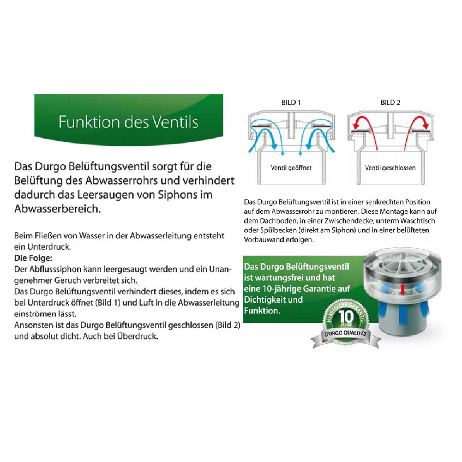 Beim Abfließen von Abwasser in der Abwasserleitung entsteht ein Unterdruck. Dadurch kann der Abflußsiphon leergesaugt werden und ein übler Geruch verbreitet sich. Das Belüftungsventil von Durgo verhindert dieses, indem es sich bei Unterdruck öffnet und Luft in das Abwassersystem einströmen lässt. Ansonsten ist das Durgo Belüftungsventil geschlossen und absolut dicht. Auch bei Überdruck