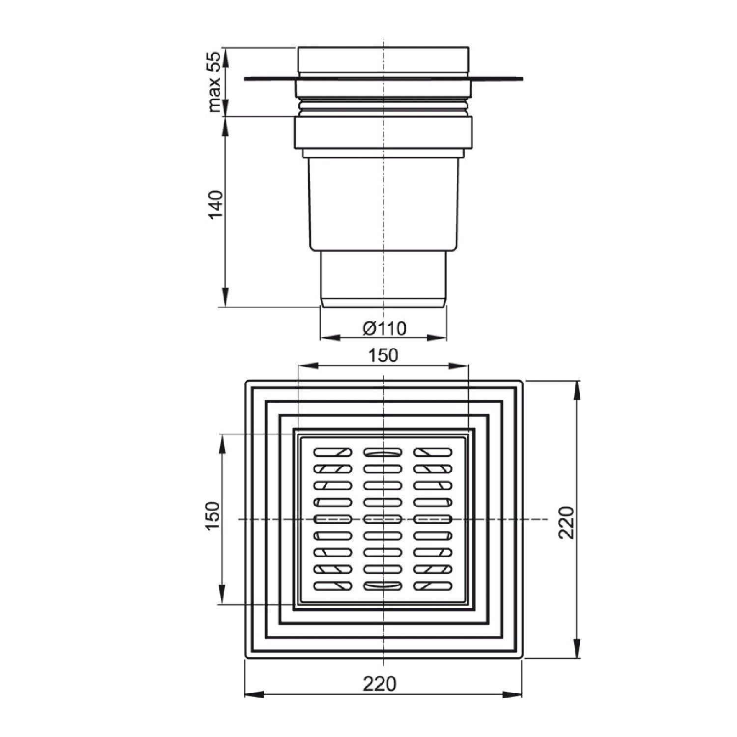 - Alcaplast APV13 Edelstahl Bodenablauf 150x150 mm Serie APV1 senkrecht