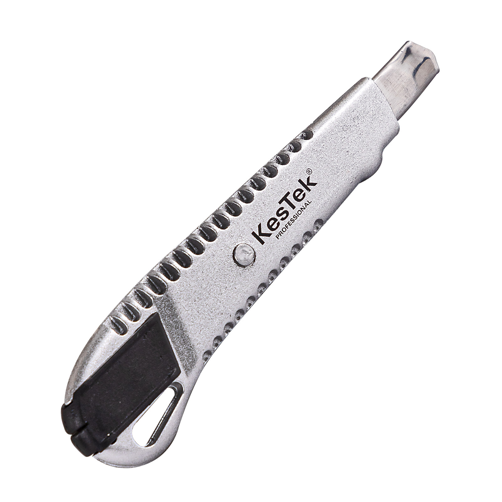 Cuttermesser Alu 9-18mm mit schwarzer SK5 KlingeOriginal KesTek Alu Cutter 9-18mm mit schwarzer SK5 Klinge. Der ergonomisch geformte Griff liegt gut in der Hand und erlaubt einen festen Druck auf das zu schneidende Material. Die Metallführung gewährleistet eine präzise Schnittlinie und verhindert da