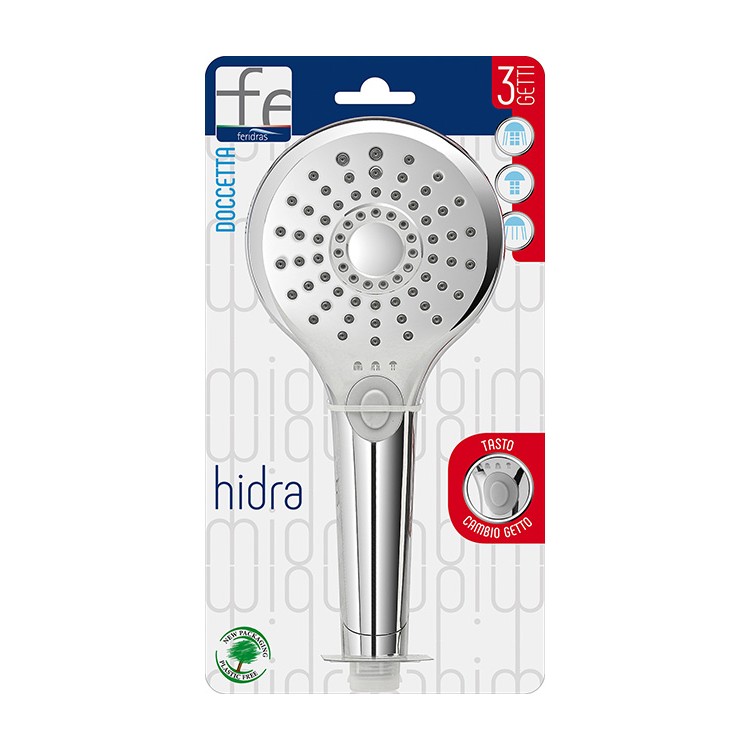 Die Feridras Handbrause aus der Linea Hidra bietet drei Strahlarten, von sanftem Regen bis kräftigem Massagestrahl, und sorgt so für ein individuelles und angenehmes Duscherlebnis.
