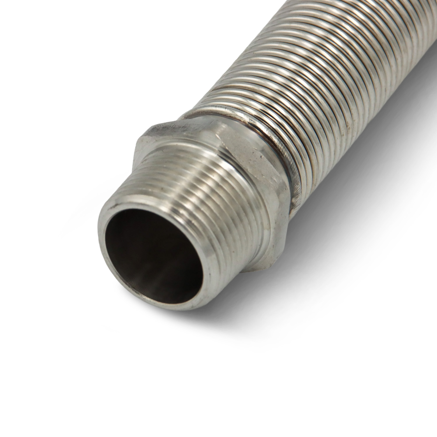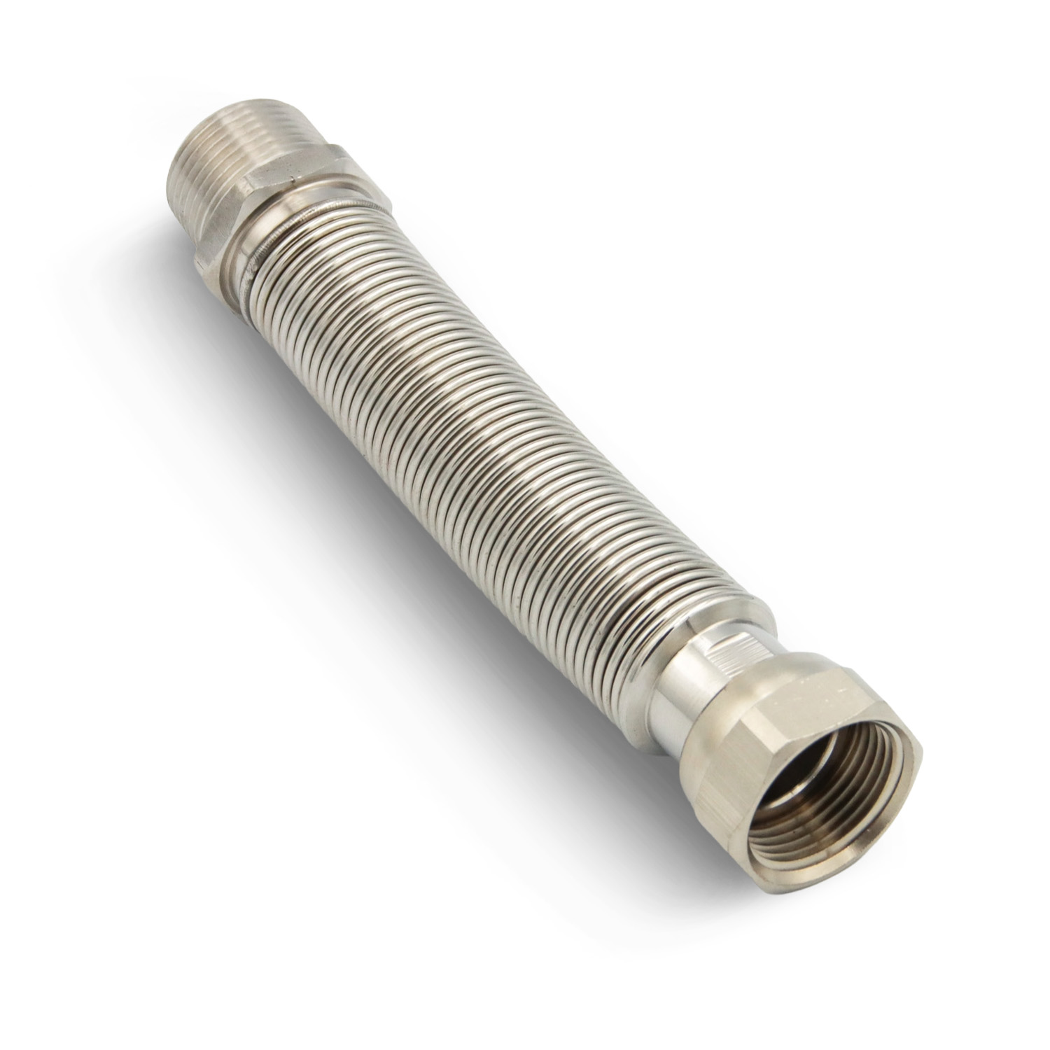 An den Schlauch angeschweißte Endstücke aus Edelstahl mit Antidrehmechanismus der ein Drehen des Schlauches beim Anziehen der Mutter verhindert.