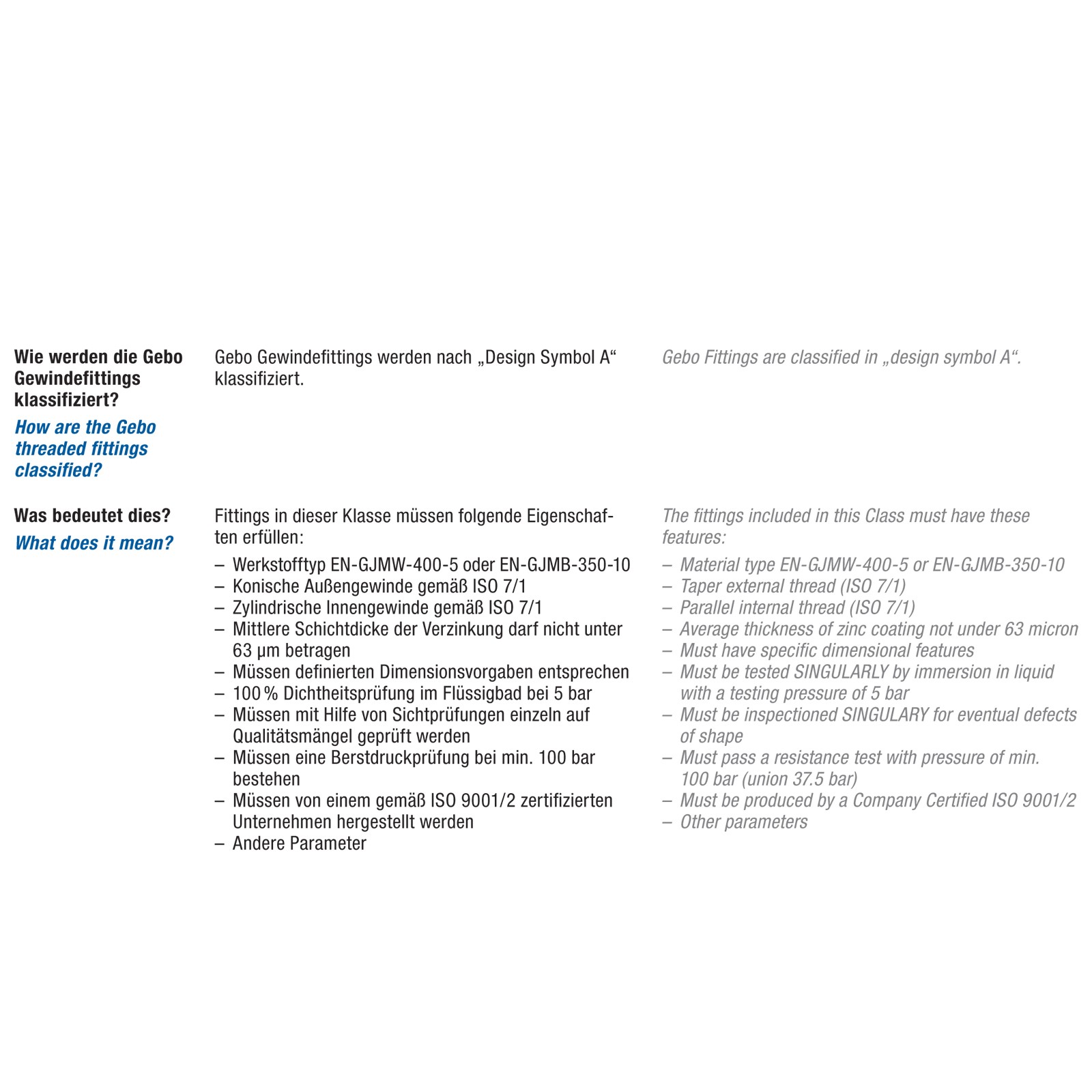 Die Gewindefittings aus Temperguss entsprechen hinsichtlich der Werkstoffe und Gewindeanschlüsse der EN 10242:1994 und verfügen über Design Symbol A. In Übereinstimmung mit der genannten Norm sind die Temperguss-Fittings Muffefür Druckluft, Wasser, brennbare Gase, Kohlenwasserstoffe und andere Medien geeignet, sofern die angegebenen Temperaturen und Druckstufen eingehalten werden.