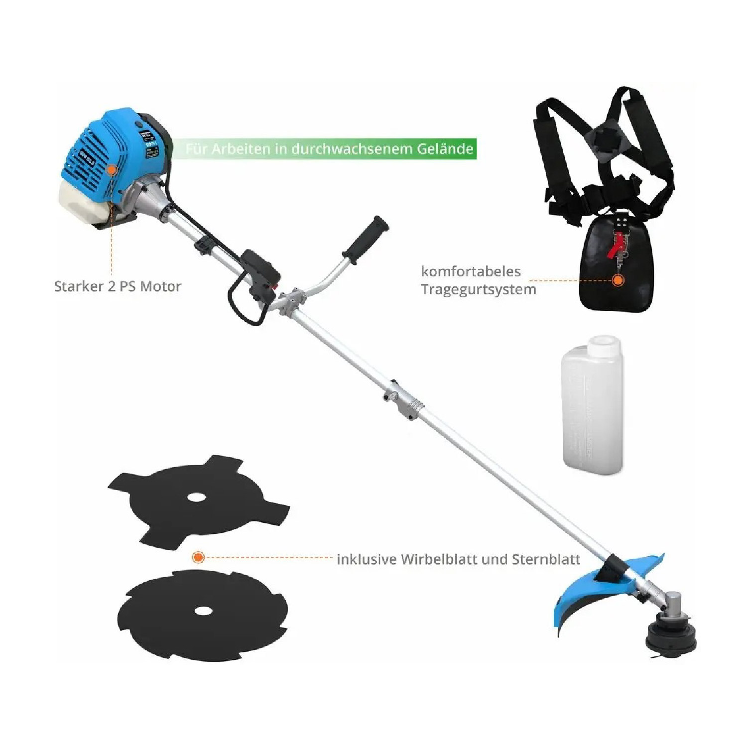 Der Tragekomfort wird durch ein ergonomisches Tragegurtsystem und einen vibrationsarmen Zweihandgriff gewährleistet, während die starre Welle für effizientes Arbeiten sorgt.