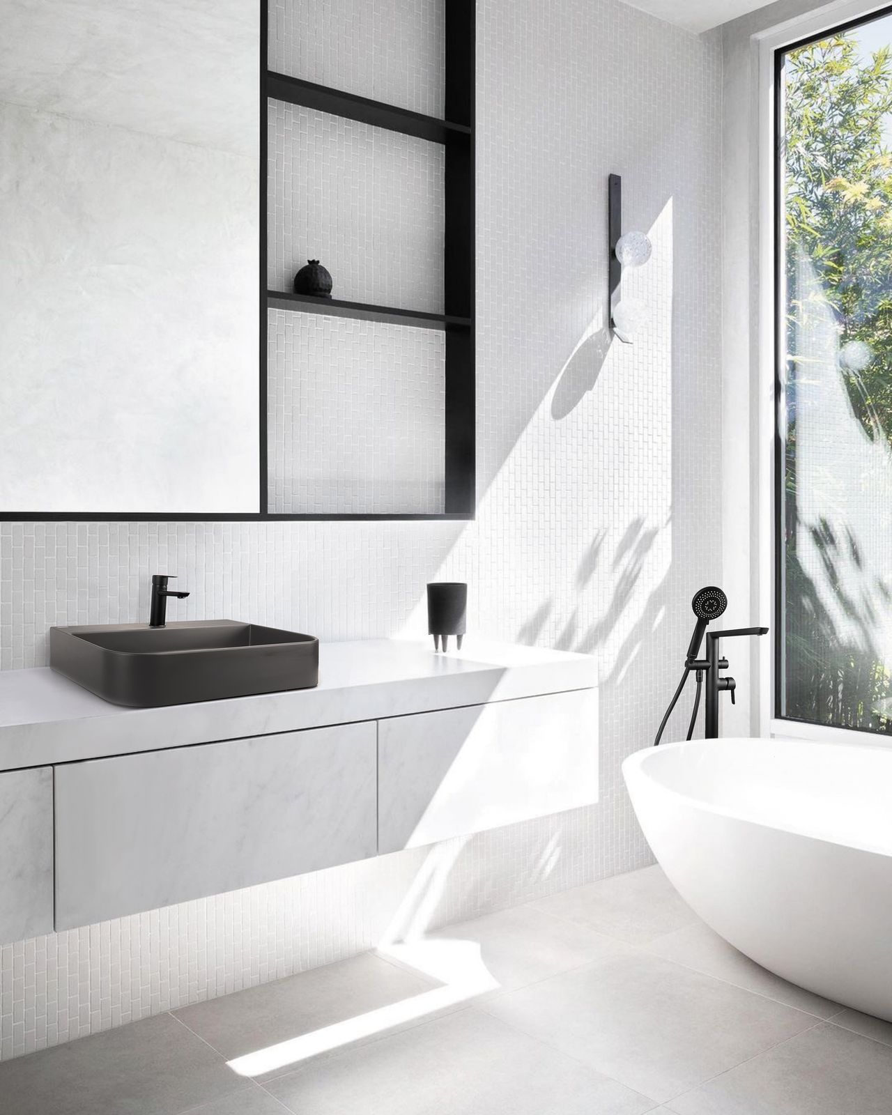 Die integrierte Ablaufverdeckung verwandelt das Waschbecken in eine klare, aufgeräumte Oase, während die eingebaute Ablage alles griffbereit hält und dem Bad ein Gefühl von Ruhe, Stil und gepflegter Eleganz verleiht.