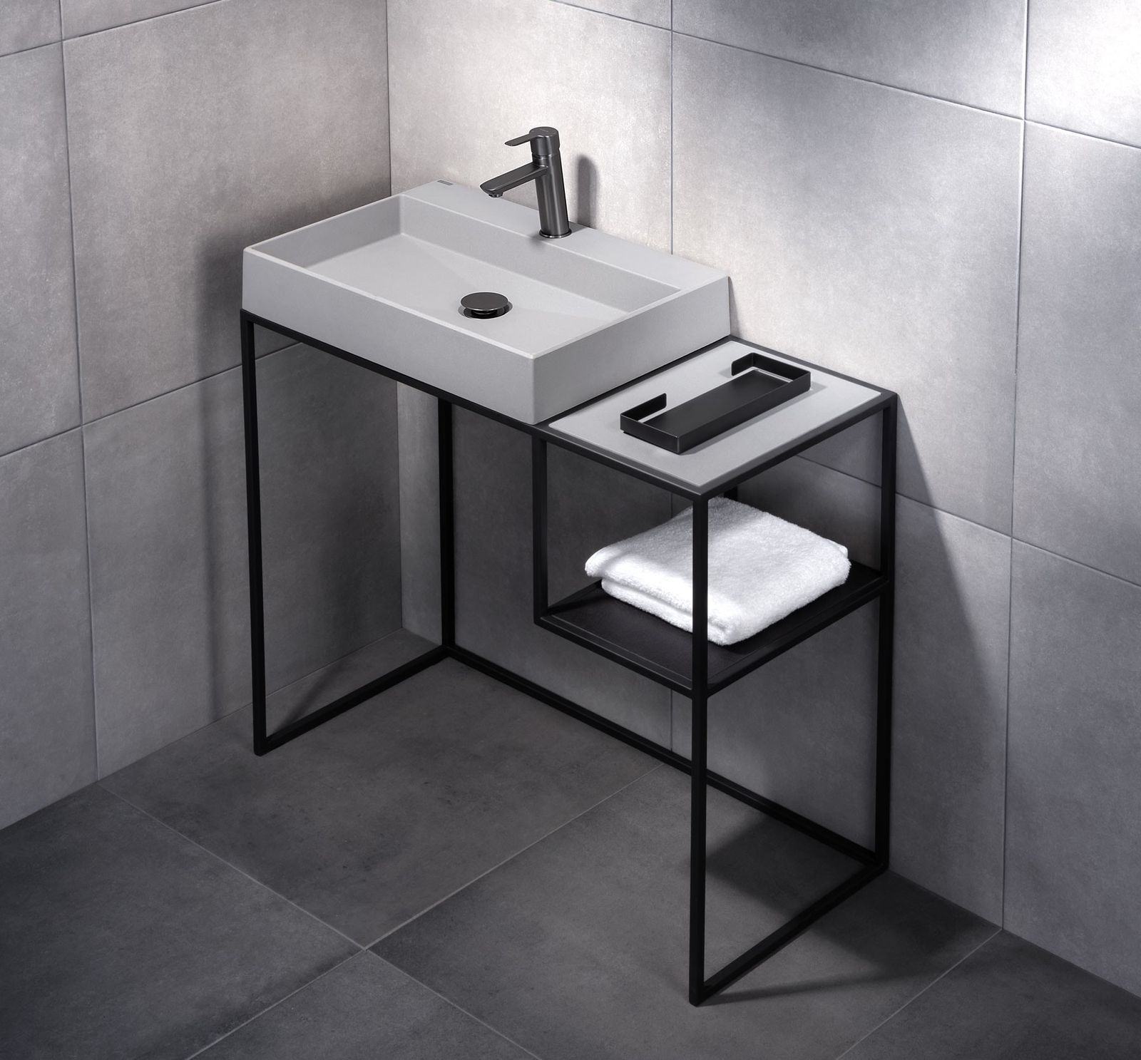 Graues Aufsatzwaschbecken in Granitoptik mit Armaturenbank "Correo"