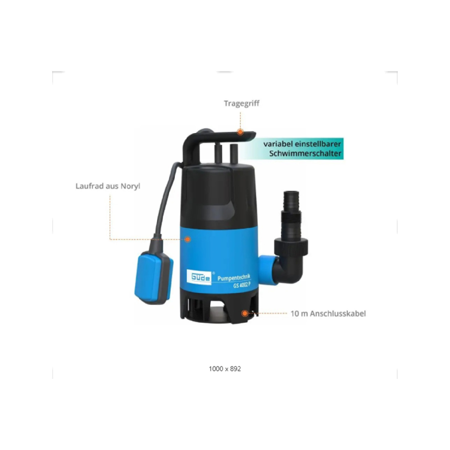 Die Schmutzwassertauchpumpe GS 4002 P von Güde ist vielseitig und somit auch in anderen Bereichen einsetzbar. So entwässert sie zuverlässig nicht nur stark verschmutzte Räume, sondern auch Gruben, Gartengewässer usw.. Der variabel einstellbare Schwimmerschalter steuert die Pumpe und sorgt dafür, dass sie keinen Schaden nimmt, sobald das Wasser abgepumpt ist. Das Gehäuse besteht aus hochwertigem und schlagfestem Kunststoff. Die Schutzwassertauchpumpe besitzt einen Thermoschutz, der bei Überhitzung des Motors für eine automatische Sicherheits-Abschaltung sorgt. Das Laufrad besteht aus formbeständigem Noryl. Damit das Innengehäuse vor Wasser geschützt ist, verfügt die Pumpe über eine Gleitringdichtung. Außerdem besitzt die handliche Schmutzwassertauchpumpe einen Tragegriff und einen 10 Meter langes Anschlusskabel. Der Anschluss ist eine Schlauchtülle mit einem Durchmesser von 25 mm.