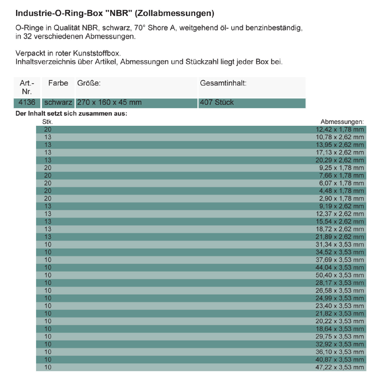 O-Ringe in Qualität NBR 70 in 32 verschiedenen Abmessungen. Verpackt in roter Kunststoffbox. Insgesamt 407 Dichtungen.
