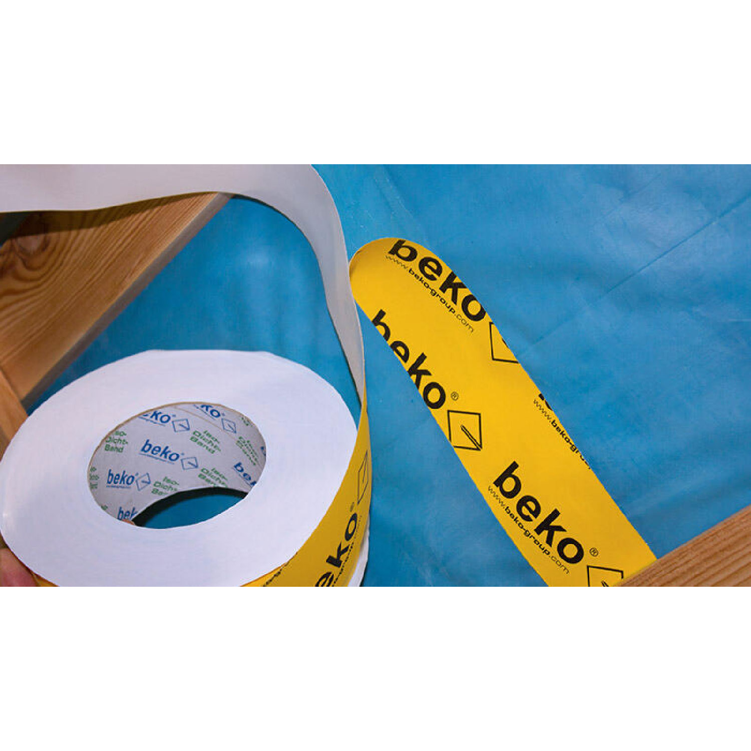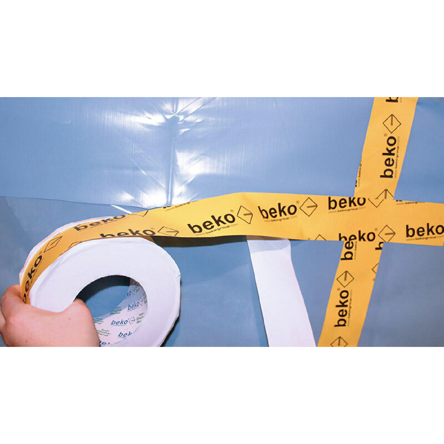 Untergründe müssen tragfähig, trocken, staubfrei, fettfrei und haftfähig sein. Das Trennpapier lösen. Das Band mittig auf der Überlappung ausrichten und fixieren. Stufenweise das Trennpapier abziehen und dabei das Klebeband zug- und faltenfrei verkleben. Anschließend fest und kräftig anreiben. Bei Verklebungen auf OSB das Band mittig aufbringen und mit einer Hartgummirolle auf den Untergrund kräftig andrücken. Bei einer Einblasdämmung empfehlen wir, die Bahn in Laufrichtung zu verlegen. Die Verklebung erfolgt dann im Sparrenbereich, die Lattung ist vor dem Einblasen der Dämmung aufzubringen. Vor der Verklebung sind die Untergründe und Bahnen zu reinigen, und es müssen Klebetests durchgeführt werden. Bei schlechter Haftung auf porösen und saugenden Untergründen oder Isolationsmaterial mit beko Sprühprimer vorbehandeln. Die Verklebung kann nur mechanisch gelöst werden