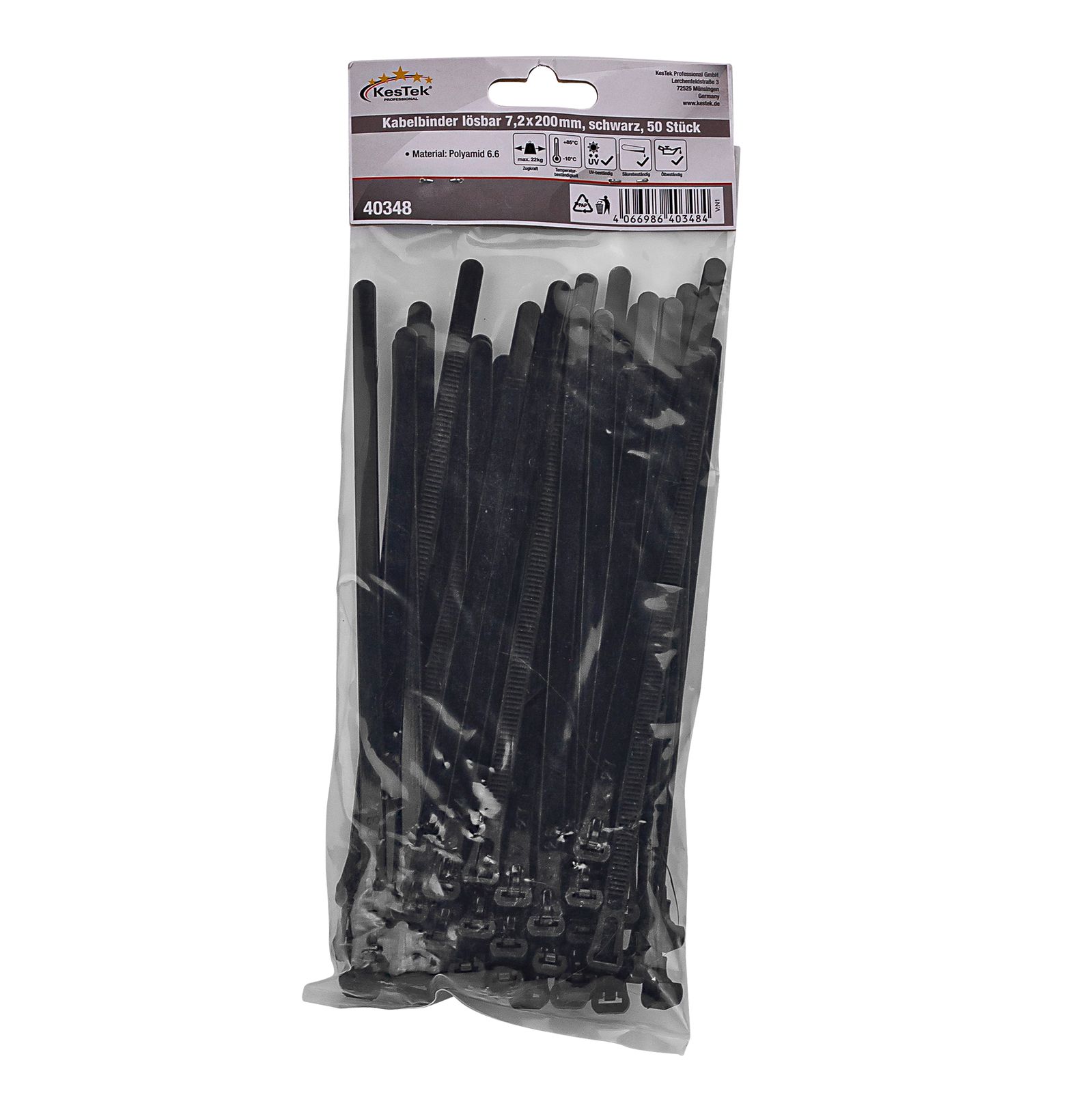 Original KesTek lösbare Kabelbinder 7,2x200mm - 7,2x400mm in schwarz 50 Stück. KesTek Kabelbinder sind robust, vielseitig und ideal für eine Vielzahl von Befestigungsmöglichkeiten. Ideal geeignet für Arbeiten in Etappen, da der Kabelbinder gelöst und wieder verschlossen werden kann. Egal ob im Heimwerkerbereich, im Büro oder in der Industrie, diese Kabelbinder bieten eine einfache und effiziente Lösung für Ihr Kabelmanagement. Unsere Kabelbinder in Industriequalität bestehen komplett aus hochwertigem Polyamid 6.6. Die Innenverzahnung garantiert einen sicheren Halt am Bündelgurt. Sie können einfach per Hand oder mit einer Zange festgezogen werden.
