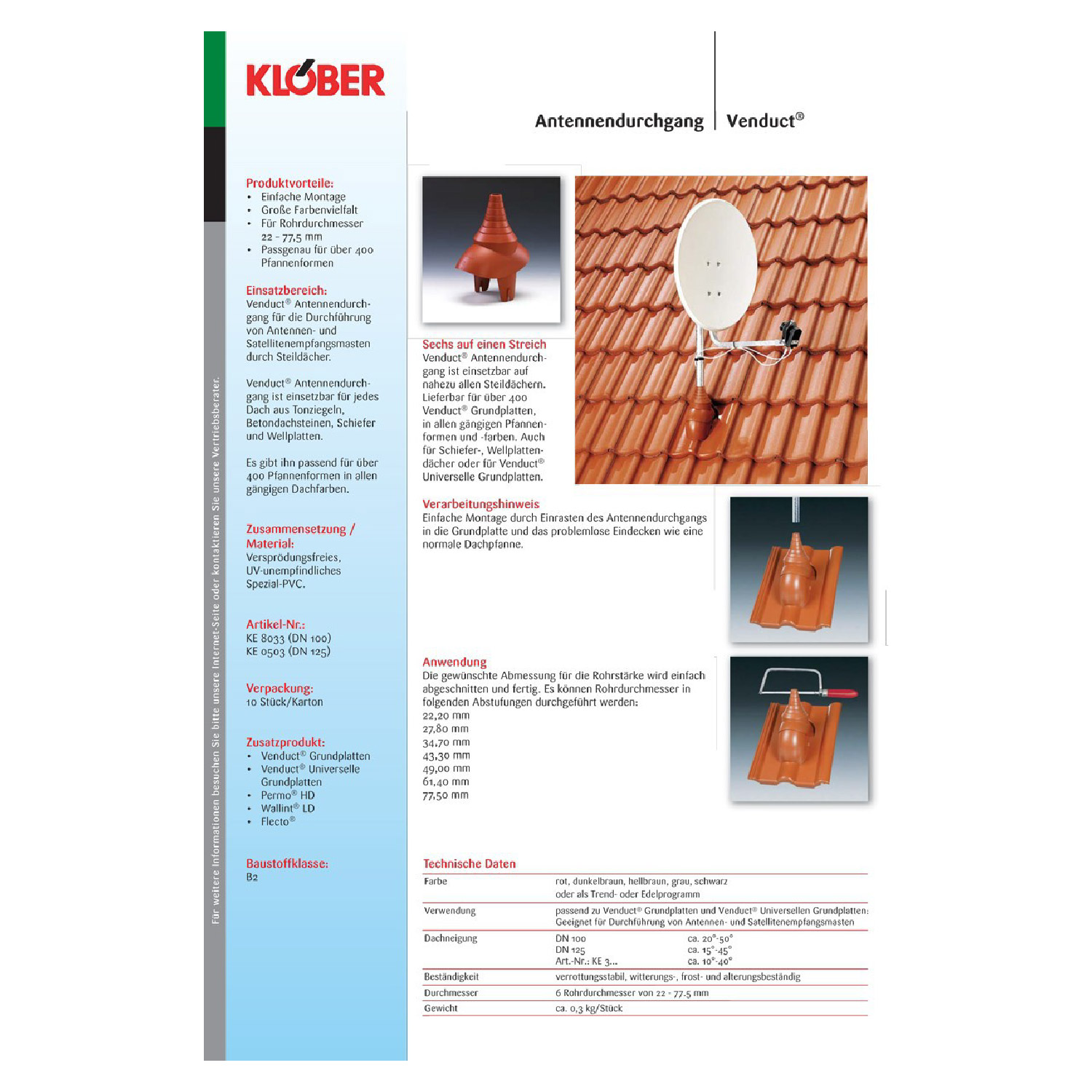 Der Venduct Antennendurchgang überzeugt durch passgenaue, schnelle Montage und jahrzehntelange Funktionssicherheit. Der Venduct Antennendurchgang ist die optimale Lösung zur Durchführung von Antennen- und Satellitenempfangsmasten (Rohrdurchmesser 22 bis 77,5 mm) durch nahezu alle Steildächer.