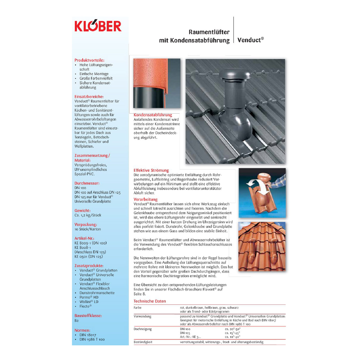 Be- und Entlüftungszubehör für das Steildach in seiner Vielfalt. Klöber ist mit seinem professionellen Programm seit Jahrzehnten ein zuverlässiger Partner für Architekten, Dachhandwerker, Installateure und den Handel. Mehr als 400 verschiedene Pfannenformen sorgen für ein Lieferangebot, das dem Dachprofi die Sicherheit einer schnellen und perfekten Arbeit garantiert. Mit den Venduct® Grundplatten und den Systemprodukten lassen sich ventilatorbetriebene Bad- und Küchenentlüftungen, die Belüftung von Abwasserrohren sowie Antennendurchgängen und Abgasrohrdurchführungen in einer einfachen Art und Weise montieren.