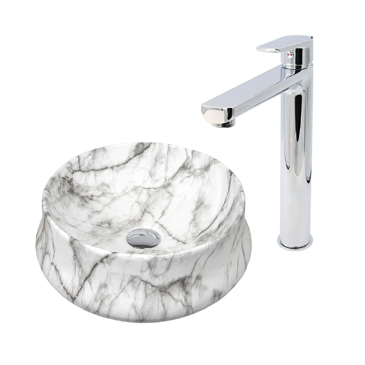 [Paket] Komplettset Einhebel Waschtischarmatur "Albuch" hoch + Aufsatz Waschtisch rund 36 cm weiß