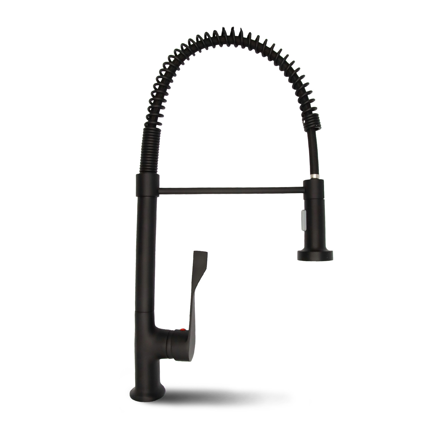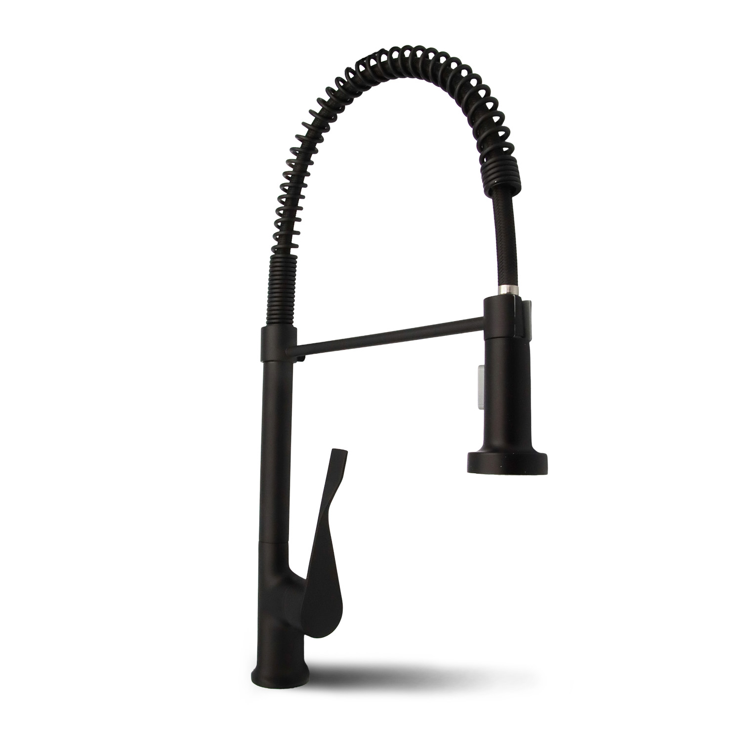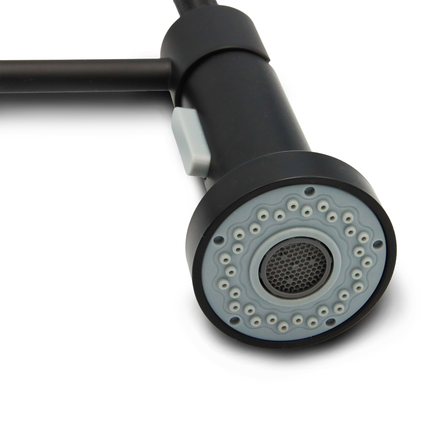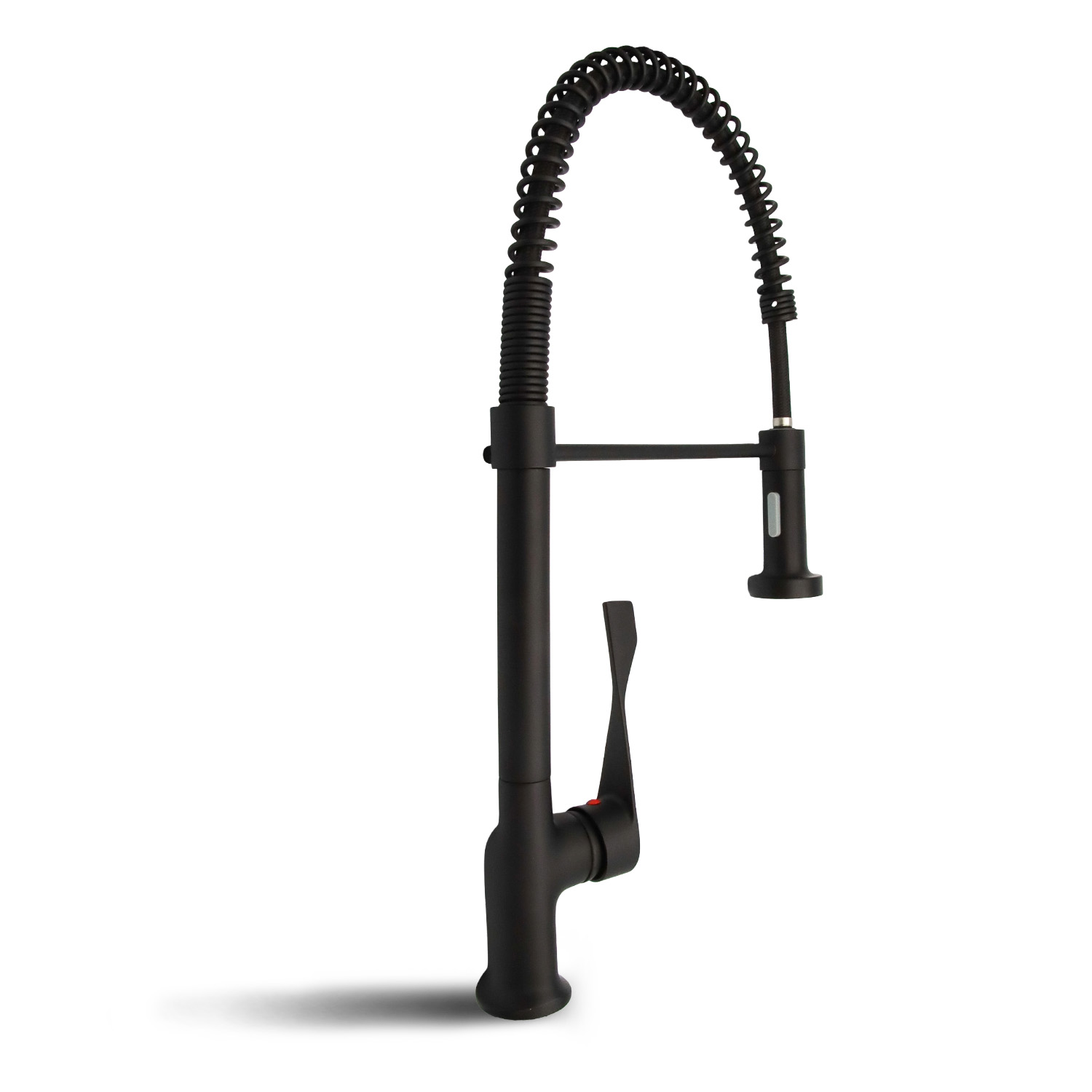Der Einhebel-Küchenmischer Serie Kitchen mit Feder-Auslauf in edlem Schwarz matt von Feridras bringt professionelle Funktionalität und modernes Design in Ihre Küche.