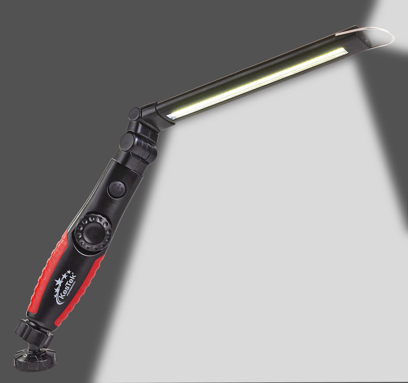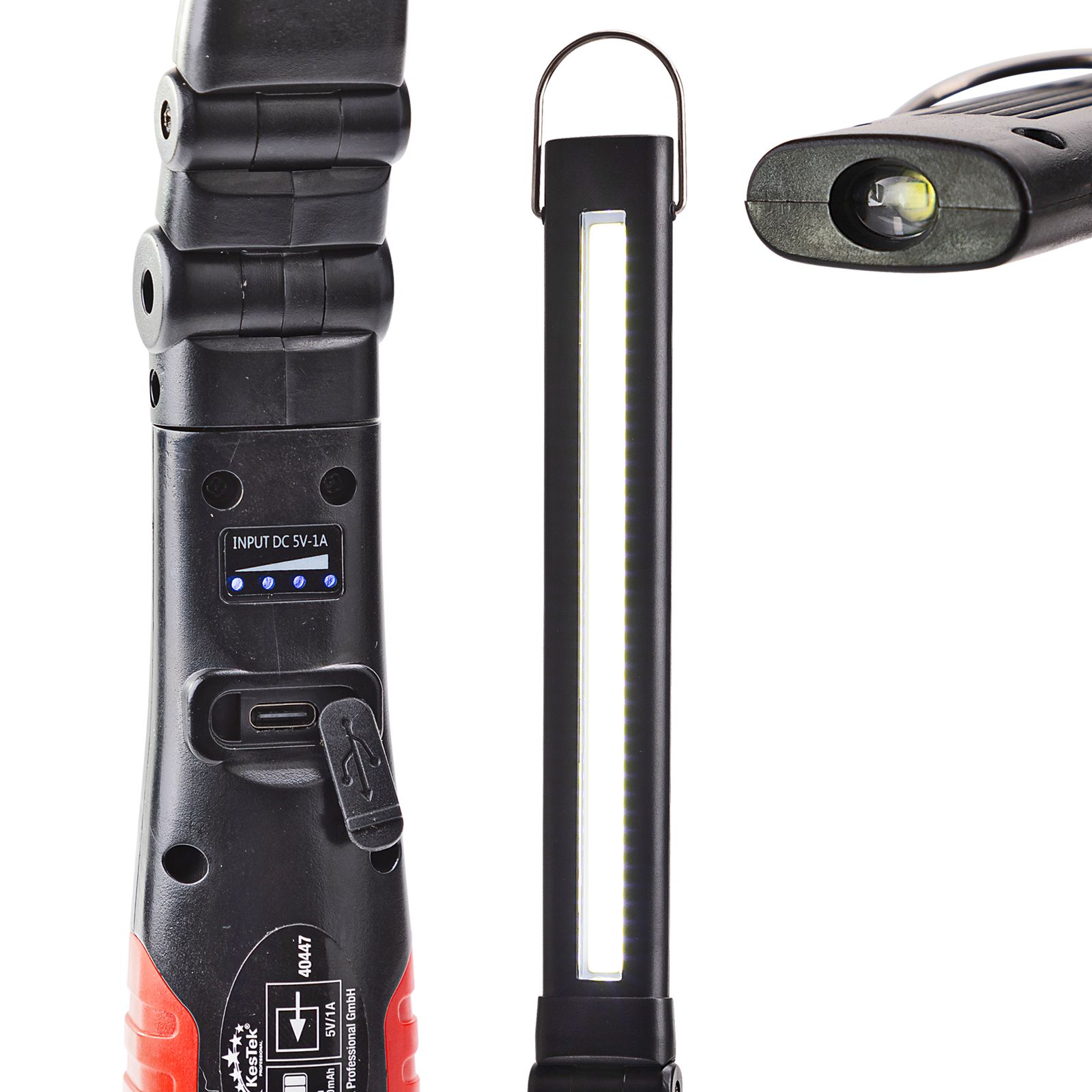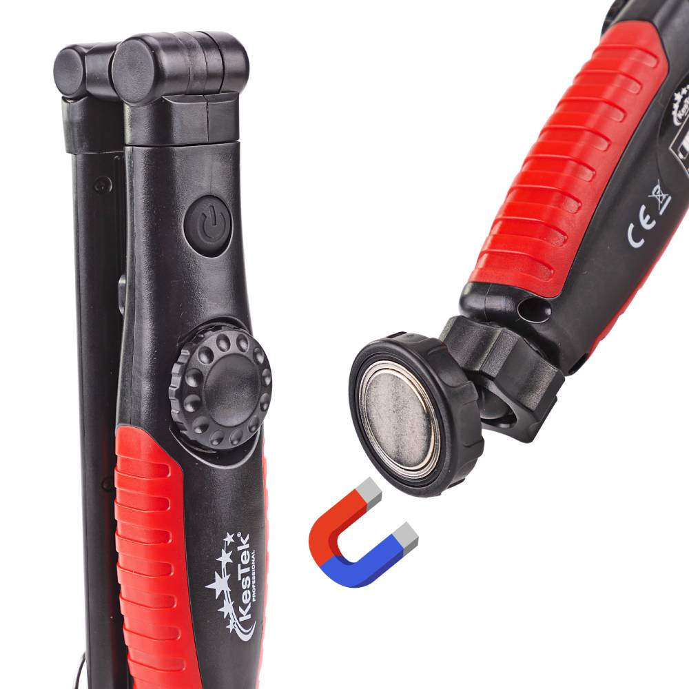 Die handliche, mobile Lichtquelle ist aus bruchfestem ABS-Kunststoff hergestellt. Sie ist mit einer dimmbaren COB-LED mit 5 Watt und 300 Lumen ausgestattet. Im Kopf der Leuchte ist eine SMD-LED mit 3 Watt und 60 Lumen verbaut. Diese wiederaufladbare Arbeitsleuchte wird von einer eingebauten 2000-mAh-Batterie gespeist und verfügt über eine Akku-Ladestatusanzeige im Griff. Der Leuchtenkopf ist klappbar, schwenkbar und um 270° drehbar. Der Magnetfuß mit Kugelgelenk und der praktischen Aufhängehaken ermöglichen das Arbeiten mit freien Händen. Die Ladebuchse ist mit einem geschützten USB-C-Anschluss versehen. Im Lieferumfang ist ein passendes Ladekabel USB-C auf USB-A in 30 cm Länge enthalten.