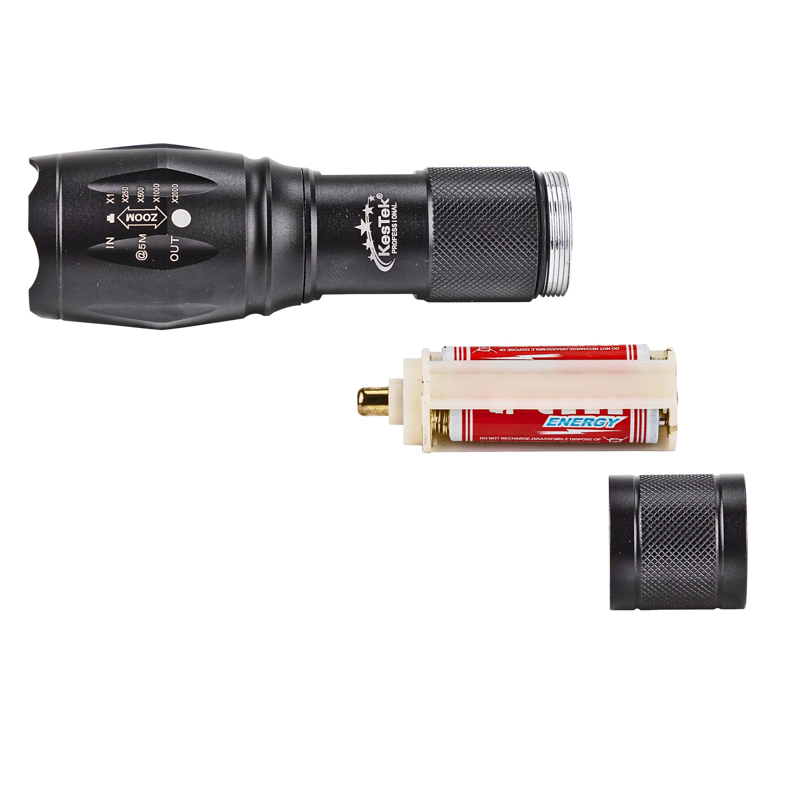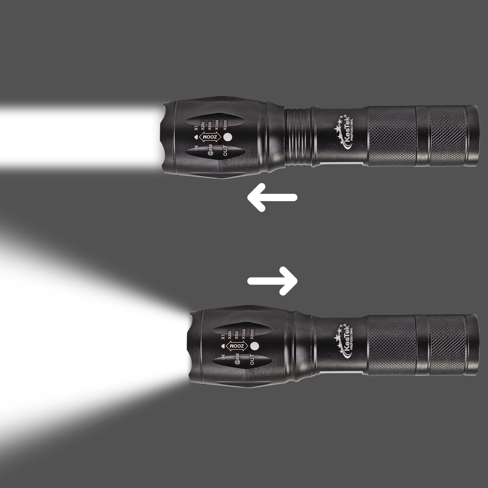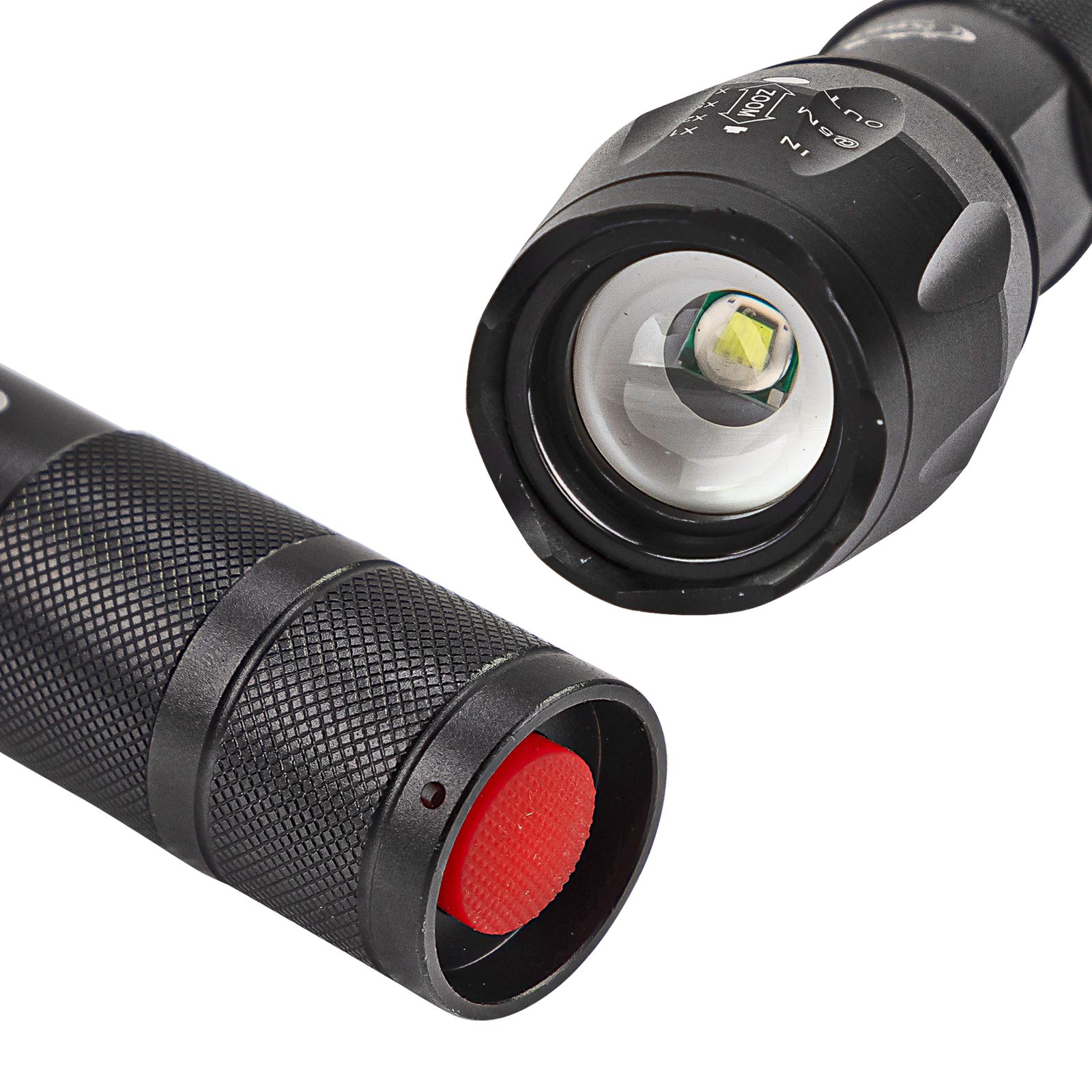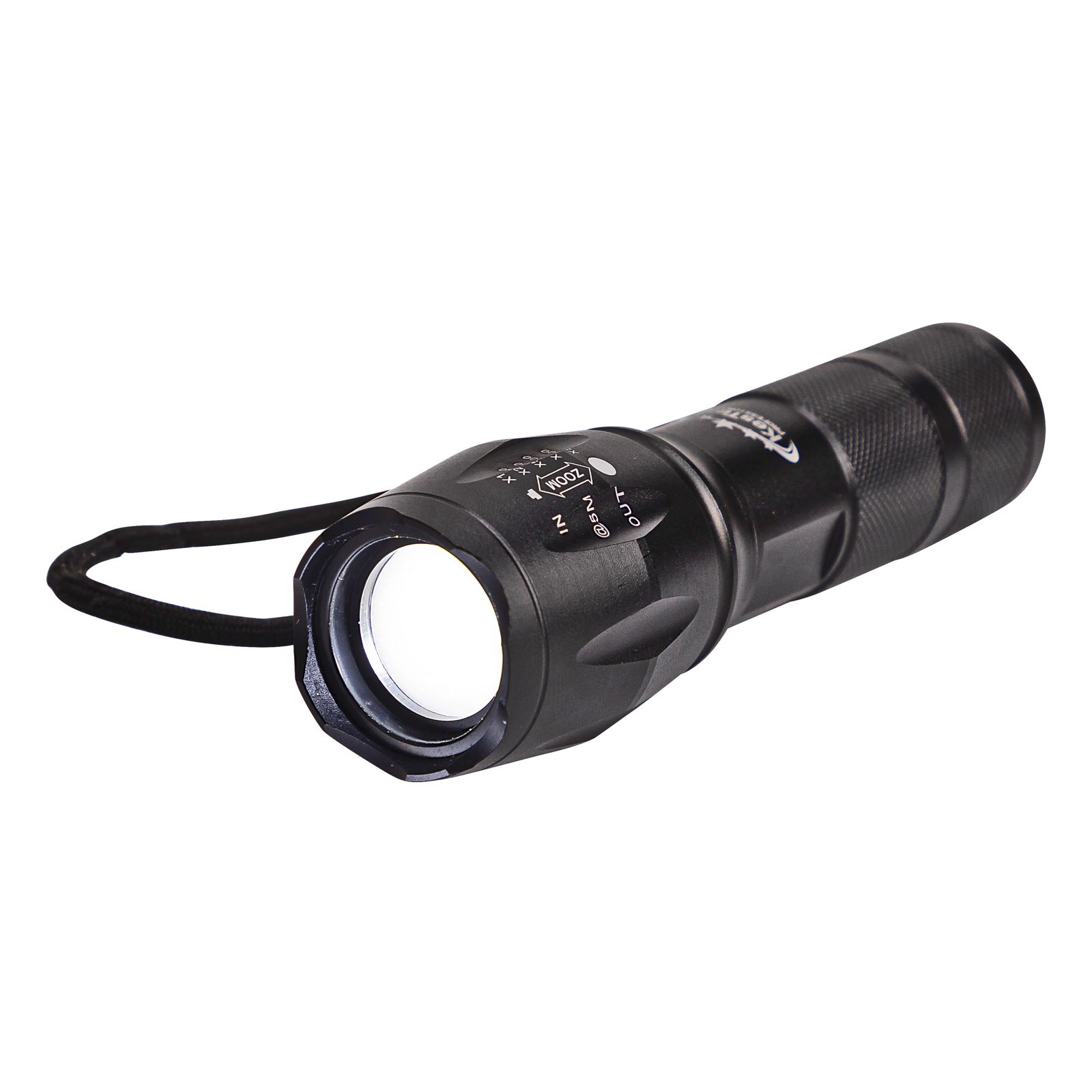 Die Taschenlampe aus hochwertigem Aluminium mit Handschlaufe ist mit einer 10-Watt-T6-LED-Technik ausgestattet und kann am Endschalter an- und ausgeschaltet werden. Sie erreicht eine Helligkeit von 300 Lumen und eine Leuchtdauer von maximal acht Stunden. Ihre Leuchtweite beträgt 130 bis 150 Meter. Der Lichtkegel ist durch eine Zoomfunktion verstellbar. Im Lieferumfang sind 3 Micro-AAA-Batterien enthalten.