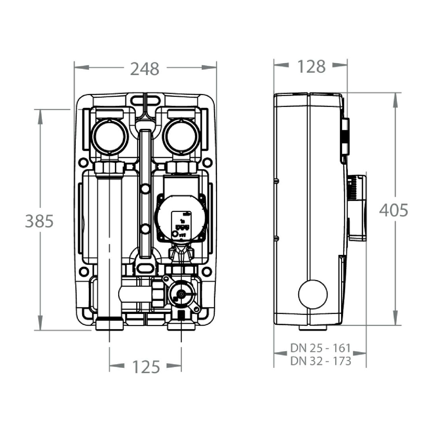 Die Pumpengruppe besteht aus einer hocheffektiven Zirkulationspumpe, Isolierung, Konsole für die Wandmontage, 2 Kugelventile mit Thermometer und einem Bypassventil.