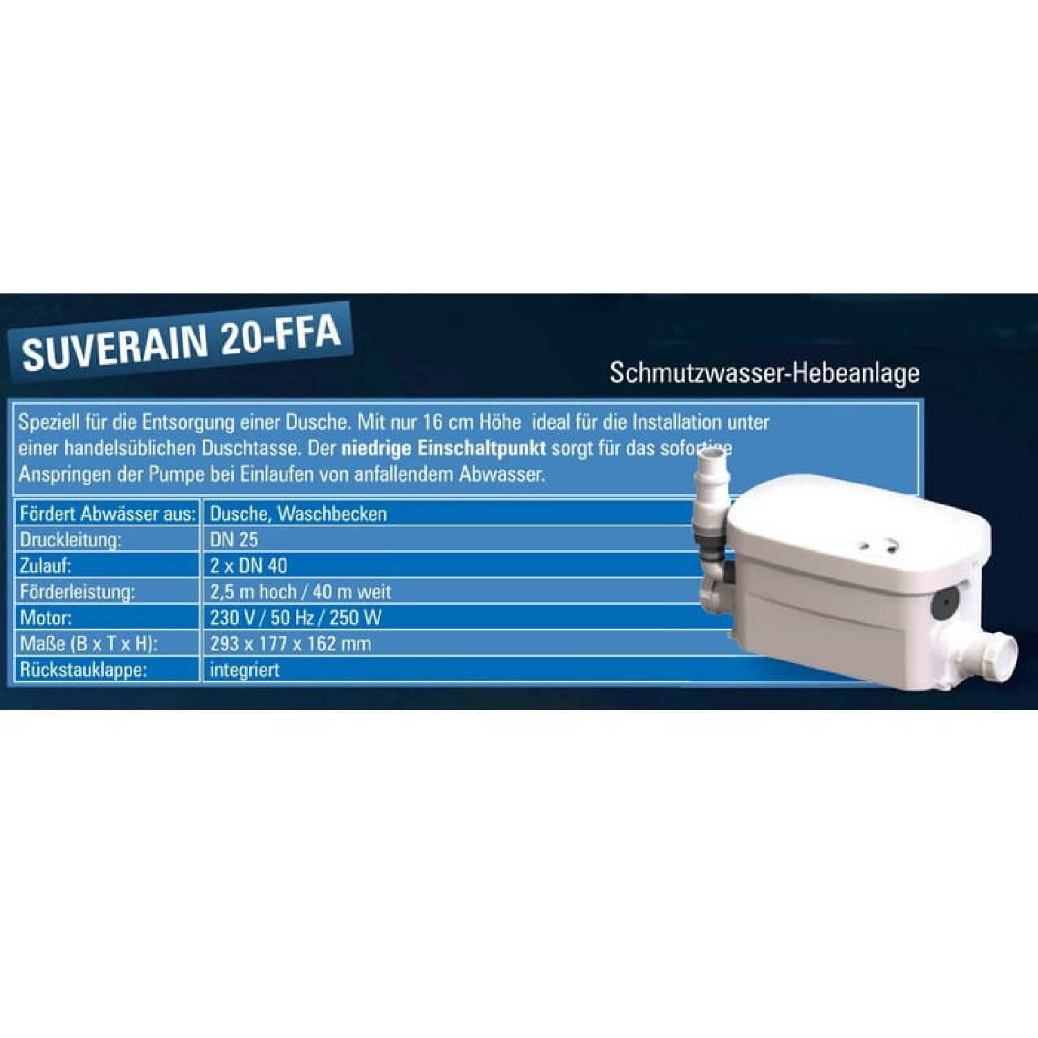 Kompakthebeanlage zur Förderung von fäkalienfreiem Abwasser unterhalb der Rückstauebene. Entsorgung von Dusche und Waschbecken. Anlage mit Rückflussverhinderer. SUVERAIN 20FFA konform zur EN 12050-2. Förderleistung bis zu 2,5 m hoch oder 40 m weit.