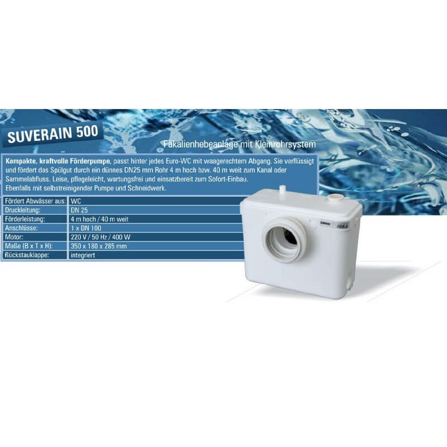 Kompakthebeanlage zur Förderung von fäkalienhaltigem Abwasser unterhalb der Rückstauebene. Entsorgung von WC. Anlage mit Rückflussverhinderer. SUVERAIN 500 konform zur EN 12050-3. Kompaktbauweise mit geruchsarmen und wasserdichtem Behälter. Förderleistung bis zu 4 m hoch oder 40 m weit.