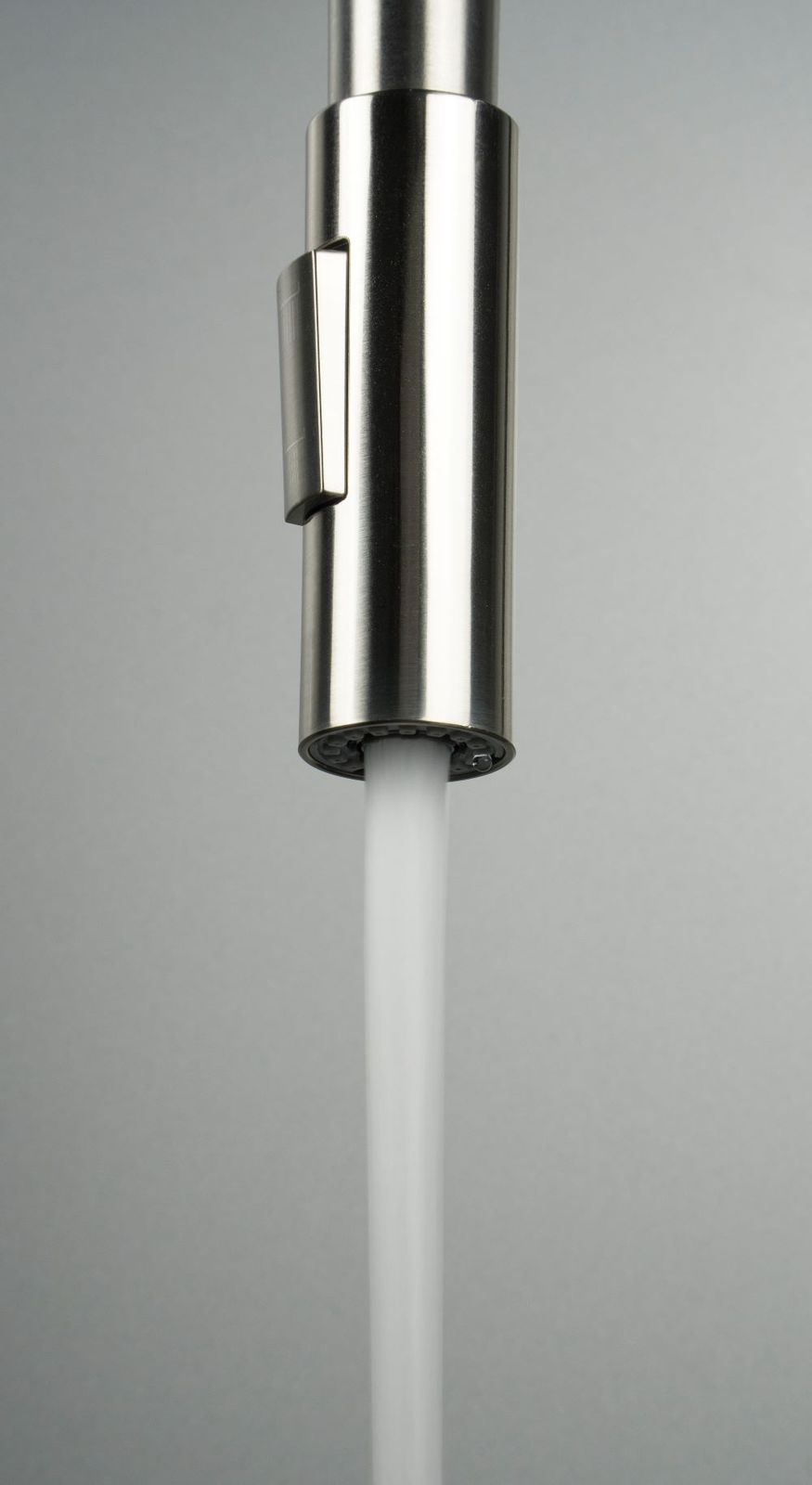 Der Wasserhahn verfügt über einen Duschkopf mit Doppelfunktion, mit dem Sie zwischen einem belüfteten Strahl und einem Regenstrahl wechseln können. Letzterer, perfekt verteilter Strahl, eignet sich ideal zum Abspülen von Gemüse, Obst oder bereits gespültem Geschirr.