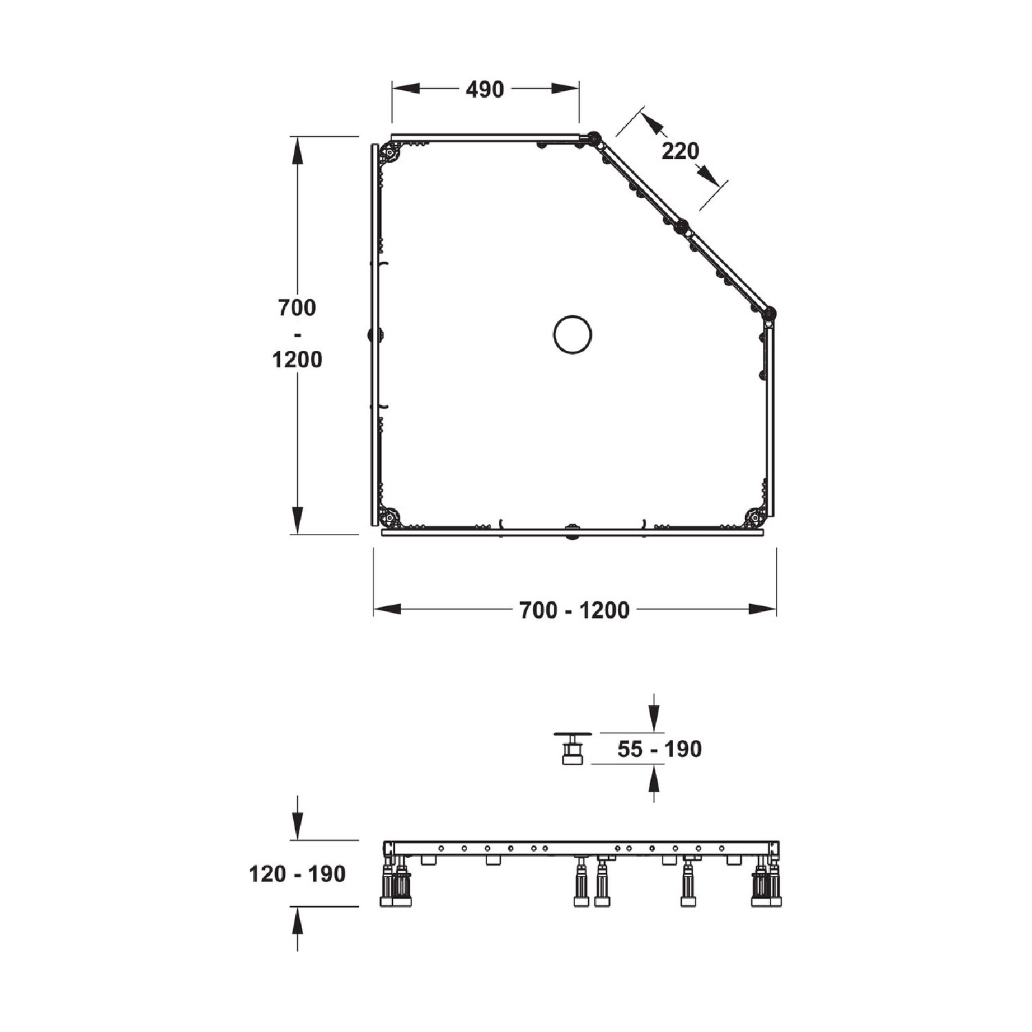 Für Duschwannen von 700 x 700 mm bis 1200 x 1200 mm, höhenverstellbar von 120 mm bis 190 mm.