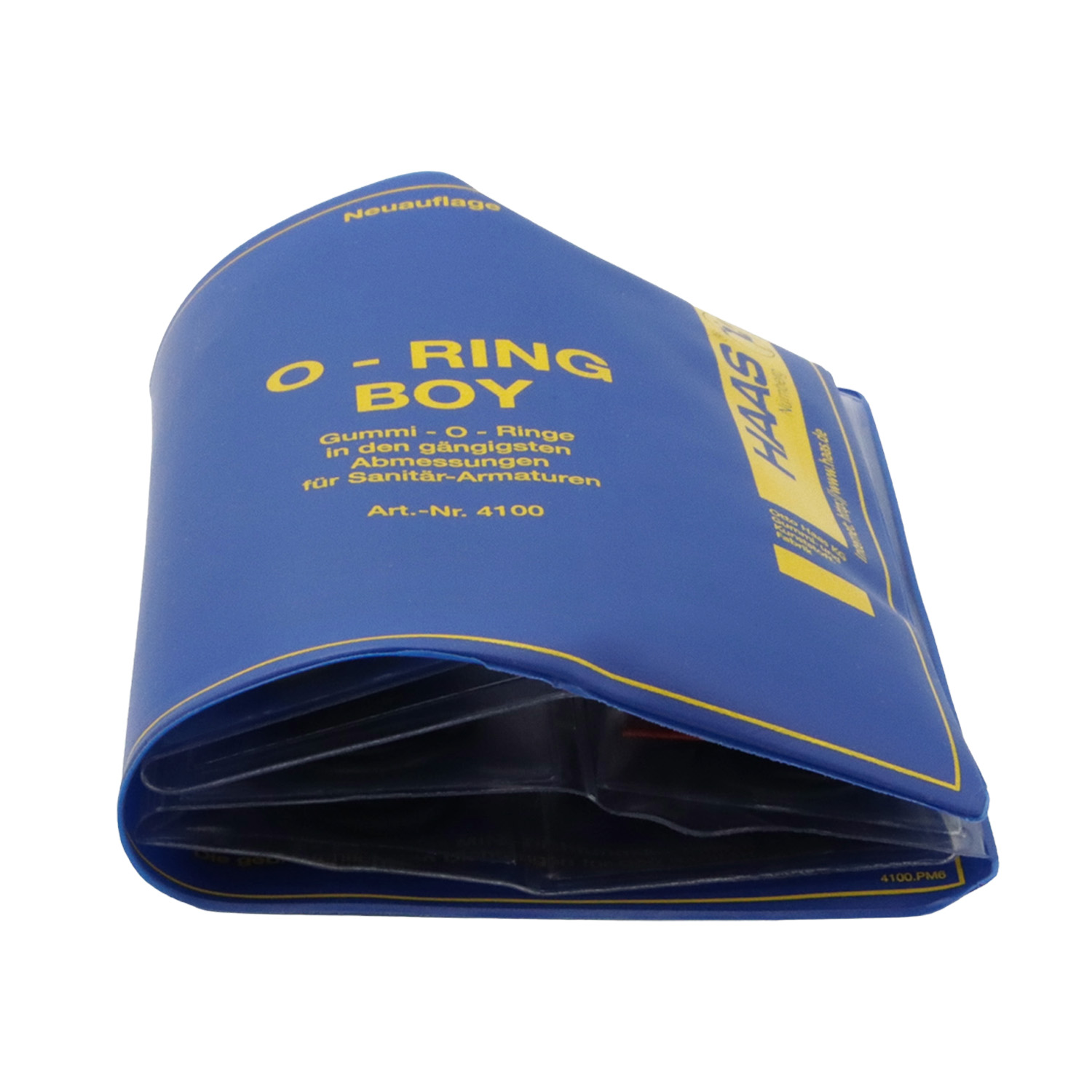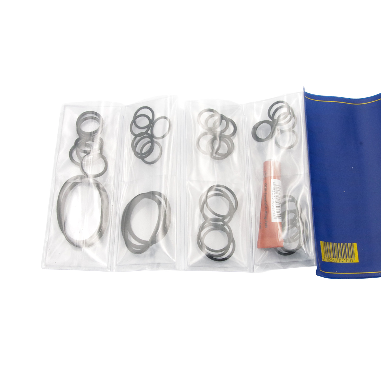 Aufklappbares Etui mit 16 gebräuchlichen Gummi-O-Ringen in NBR-Qualität, passend für viele gängige Armaturen. Das aufgedruckte Inhaltsverzeichnis erleichtert die Auswahl.