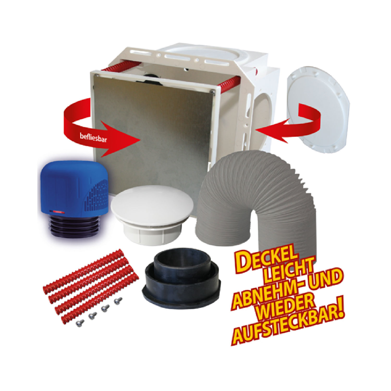OHA-Kunststoff-Wandeinbaukasten groß, befliesbar für Nass- und Trockenbau. Für die einfache und schnelle Inspektion von Belüftungsventilen. Durch zwei Deckel und einem Gummiadapter ist die Anschlussrichtung der Luftzufuhrleitung frei wählbar, Anschlussrichtung von oben, links oder rechts. Keine Verletzungsgefahr durch das Herausschneiden der Zuluft-Öffnung.