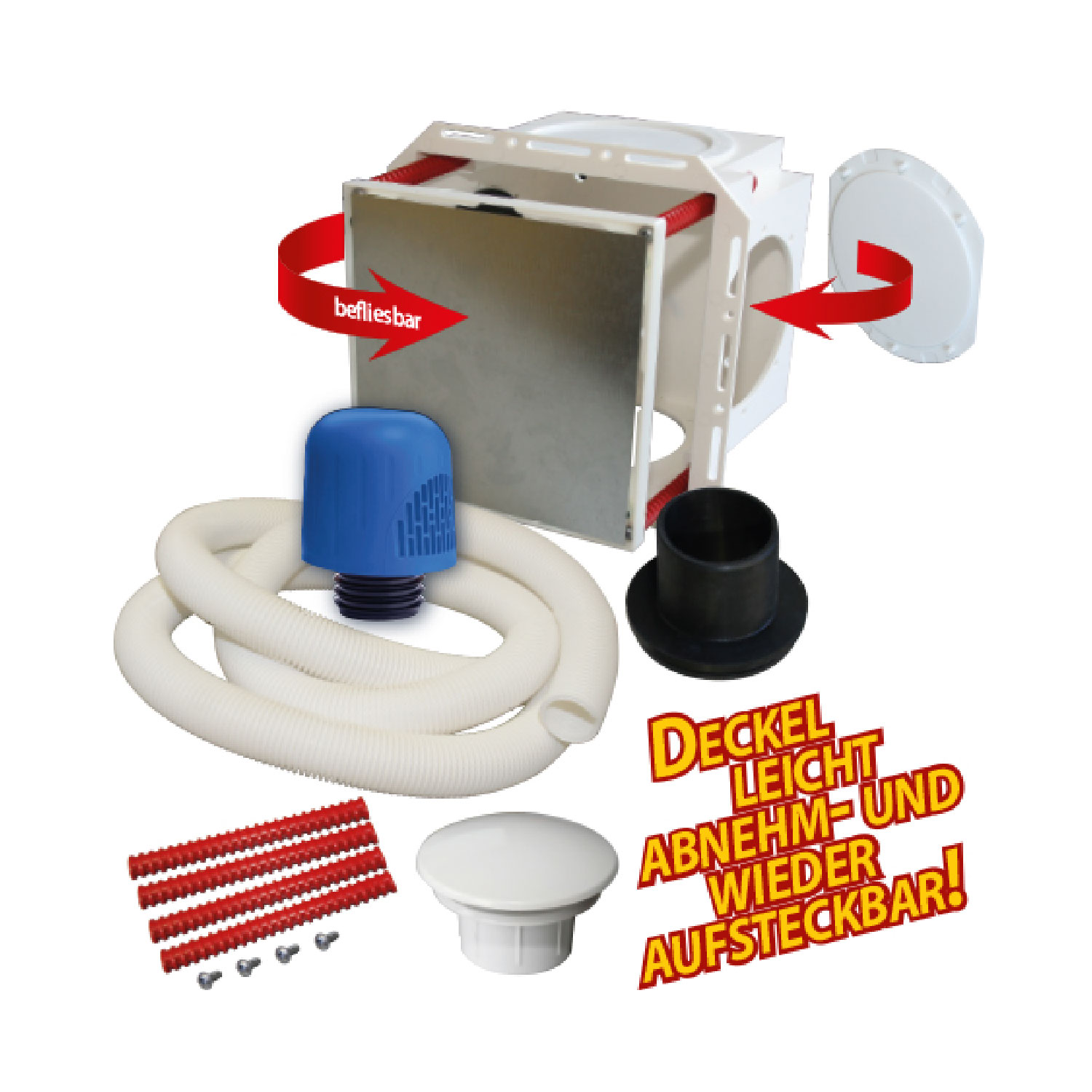 OHA-Kunststoff-Wandeinbaukasten klein, befliesbar für Nass- und Trockenbau. Er ermöglicht eine leichte und schnelle Überprüfung von Belüftungsventilen. Durch zwei Deckel und einem Gummiadapter ist die Anschlussrichtung der Luftzufuhrleitung frei wählbar, Anschlussrichtung von oben, links oder rechts. Keine Verletzungsgefahr durch das Herausschneiden der Zuluft-Öffnung und Zeitersparnis durch schnelles und einfaches Wechseln der Abdeckplatten und Gummiadapter.