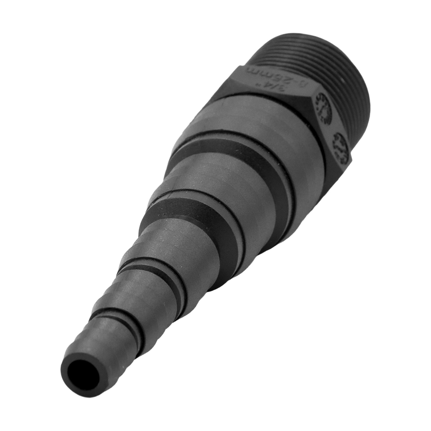 Sicherer Anschluss für Saug- und Druckpumpen, geeignet für Schläuche von 8,3 bis 26,5 mm. Der kürzbare Schlauchstutzen macht den Verbinder flexibel für metrische und imperiale Schlauchgrößen.