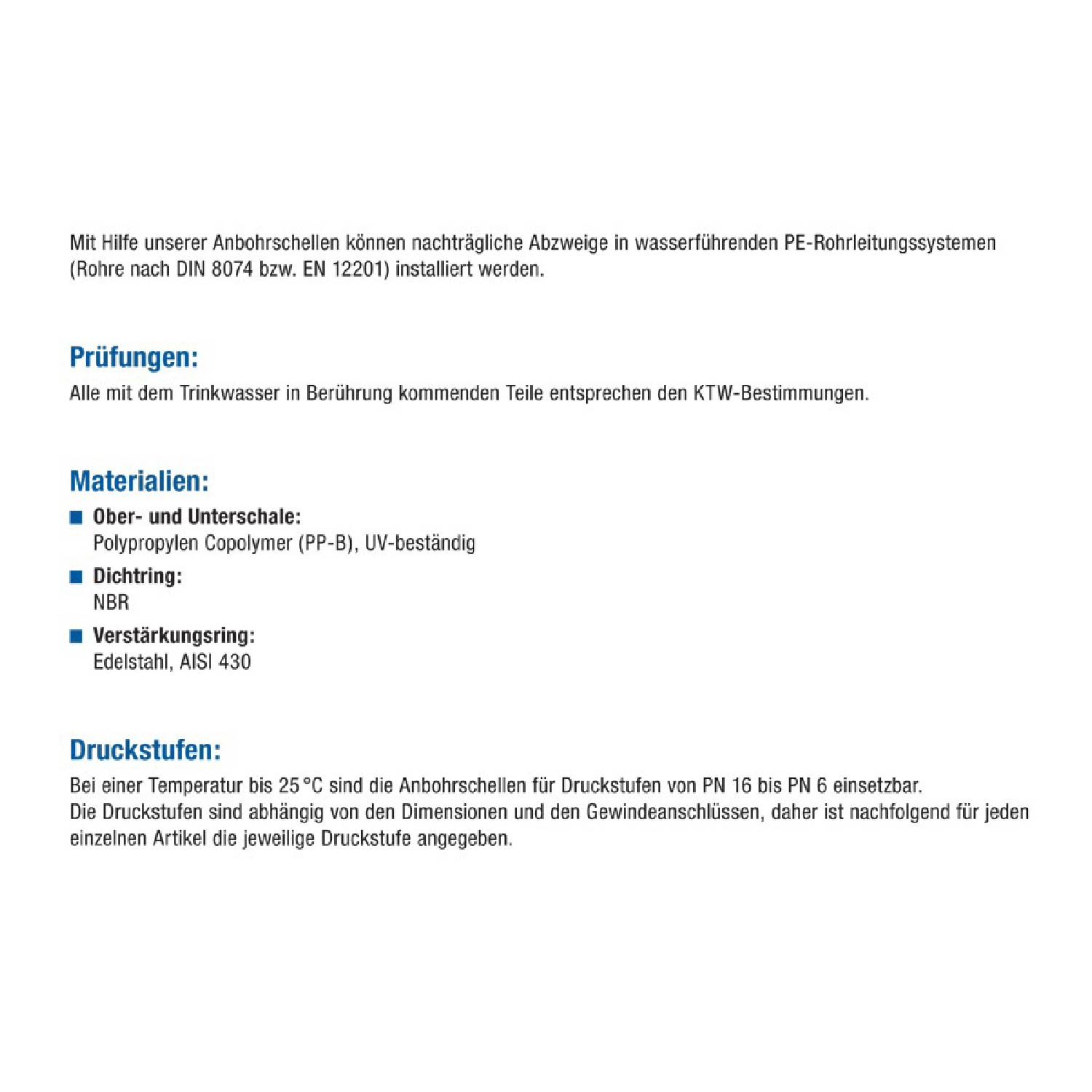 Einsetzbar in der Wasserversorgung für PE-Rohre. Mit Hilfe dieser Anbohrschellen können nachträglich Abzweige in wasserführenden PE-Rohrleitungssystemen installiert werden.