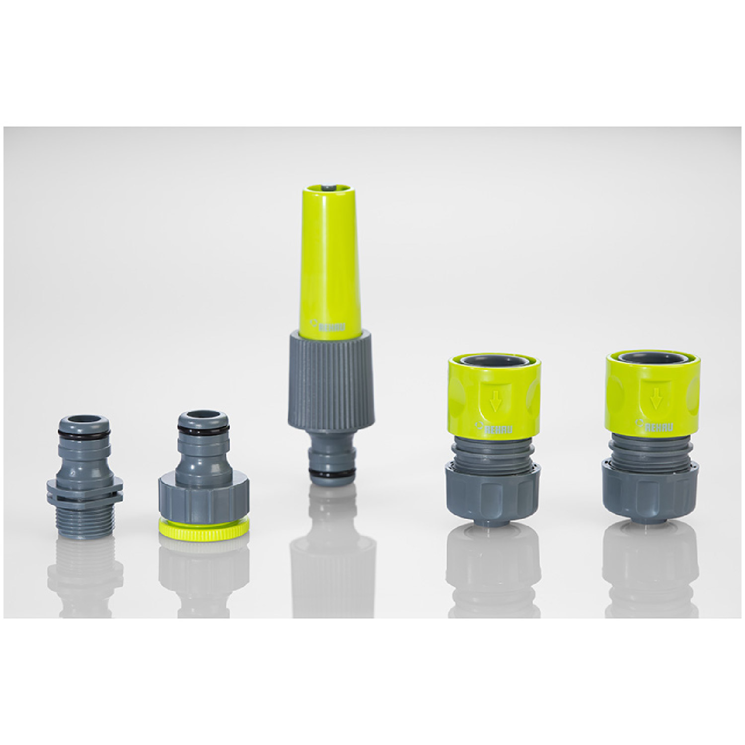 Eine Kunststoff Profi Schlauchanschluss Grundausstattung gewährleistet einen erhöhten Wasserdurchfluss und ist somit für Hochleistungsbewässerungssysteme. Die vielen Griffmulden und das Stecksystem bieten einfache Handhabung. Die stufenlos regulierbare Spritze