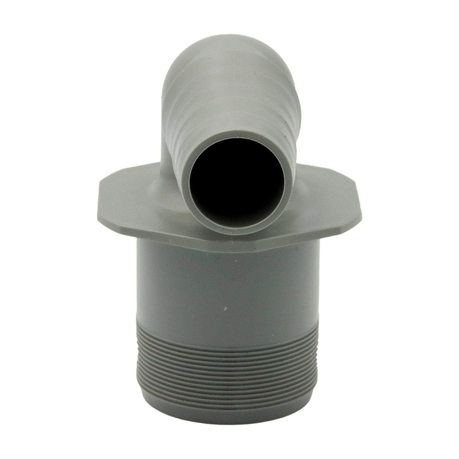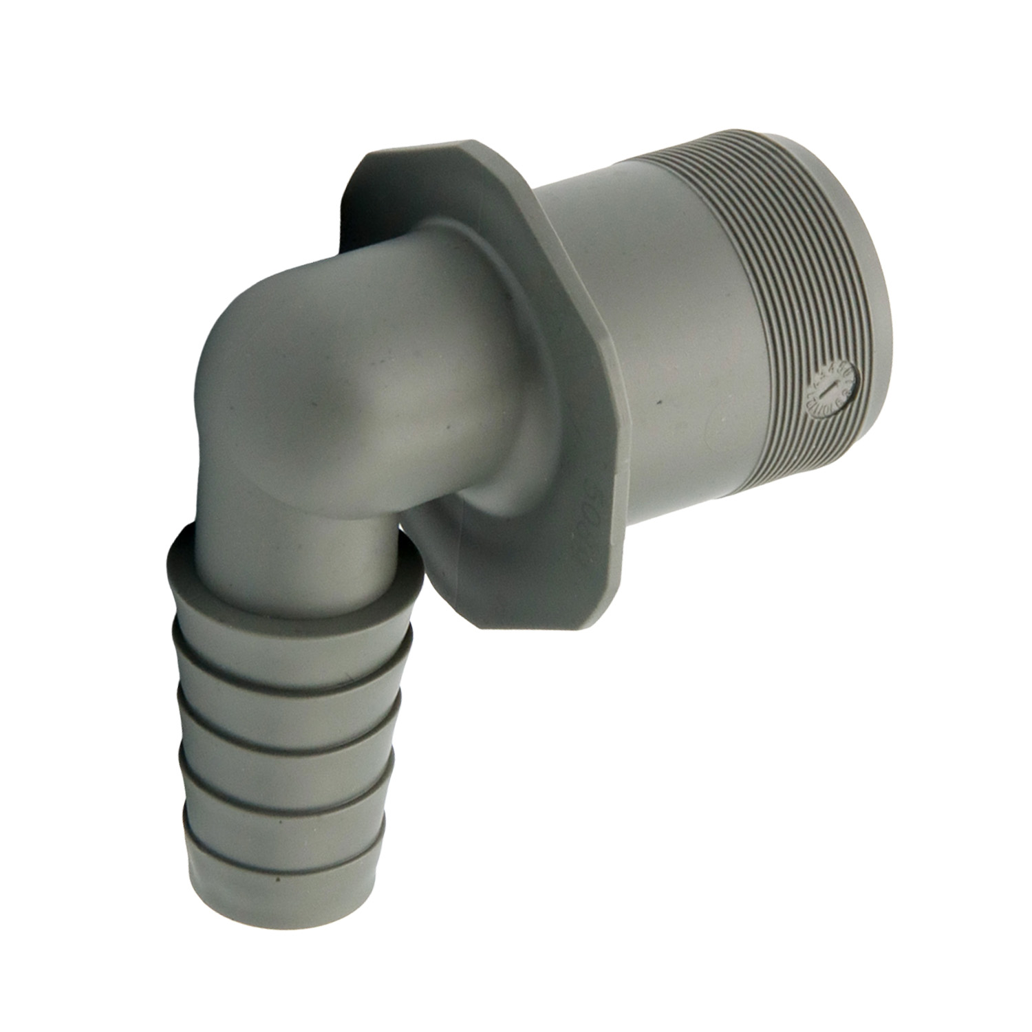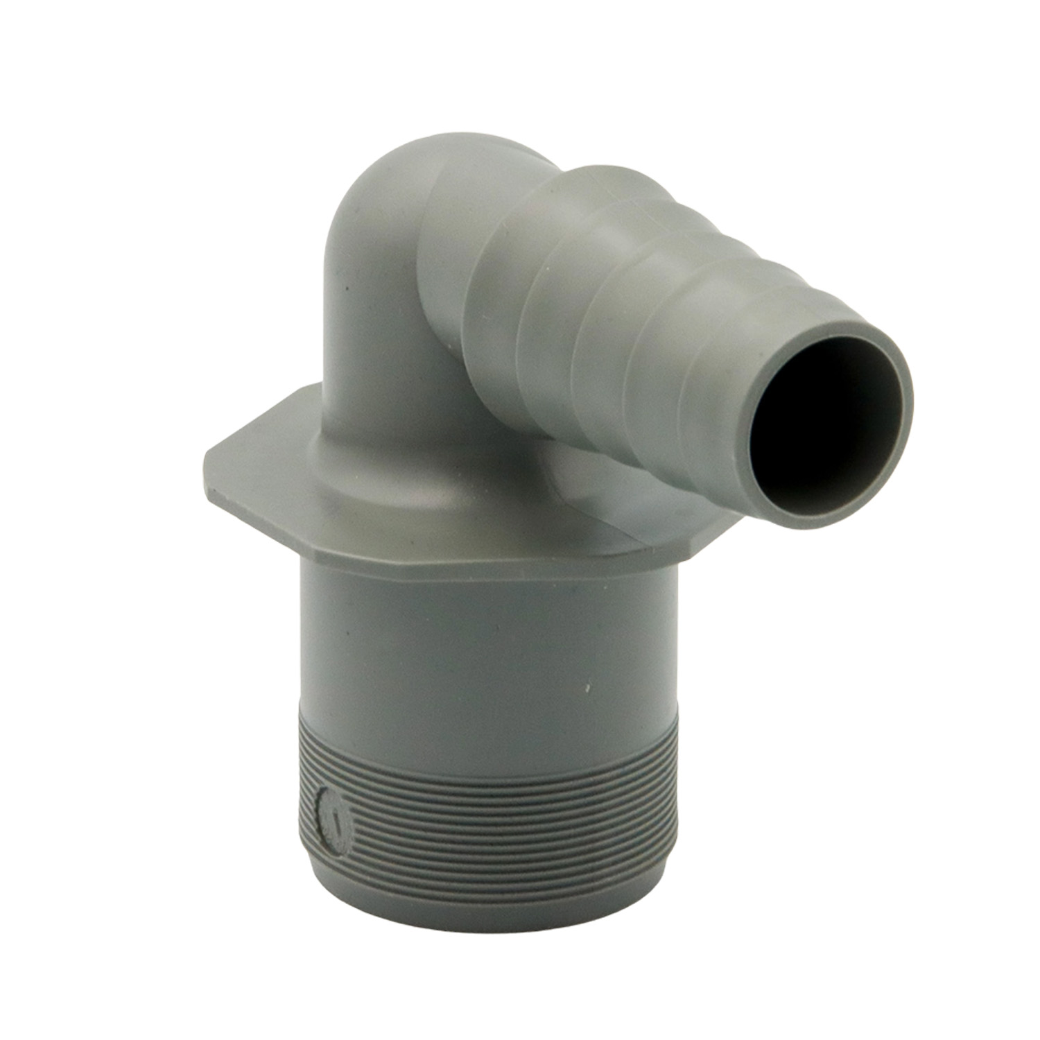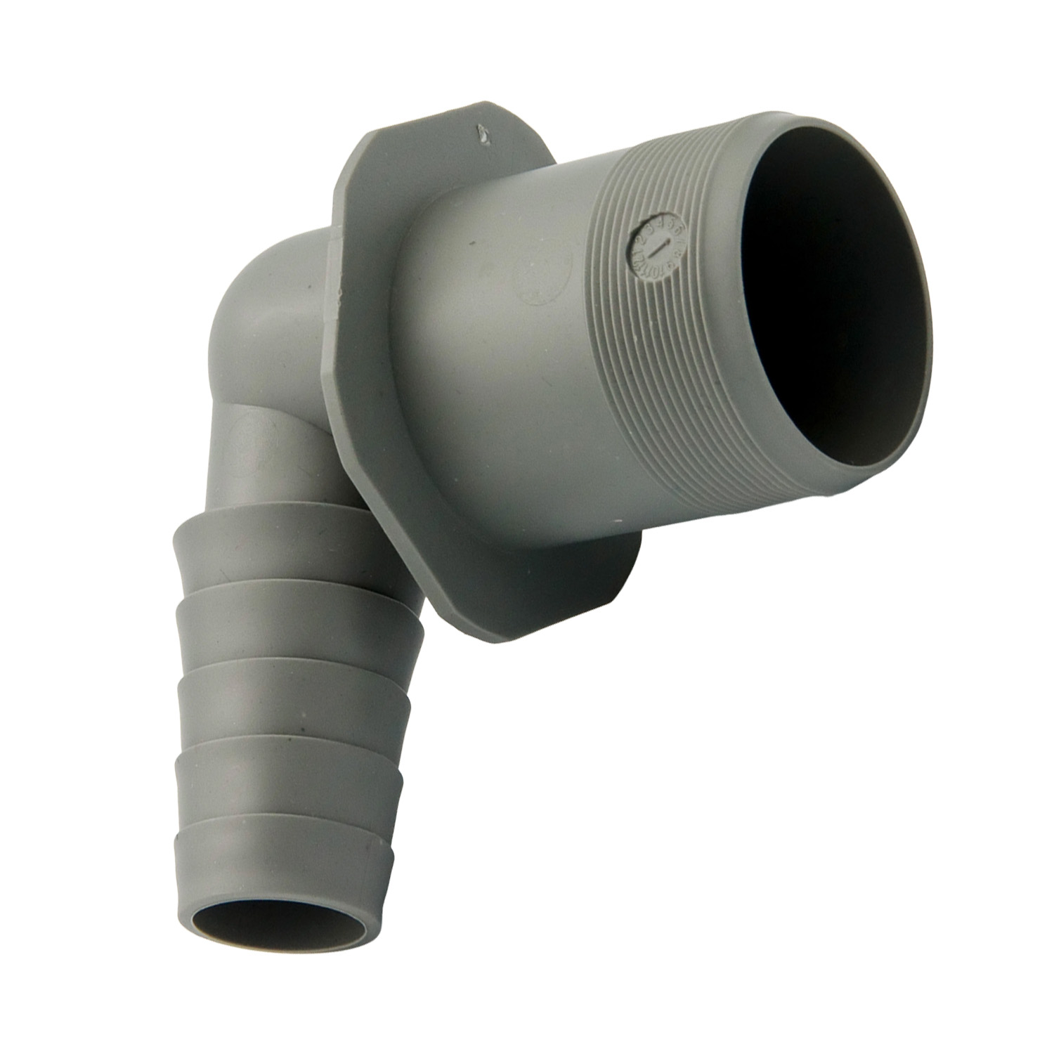 Schlauchanschluss 90° DN32 für Schläuche von 18–23 mm. Das schlagfeste Polypropylen besteht zu 100 % aus Recyclingmaterial. Durch den kürzbaren Schlauchstutzen ist der Anschluss flexibel für metrische und imperiale Schlauchgrößen einsetzbar. Rippen und Raster verhindern ein Herausrutschen des Schlauchs, während die gute chemische Beständigkeit vielfältige Anwendungen ermöglicht.