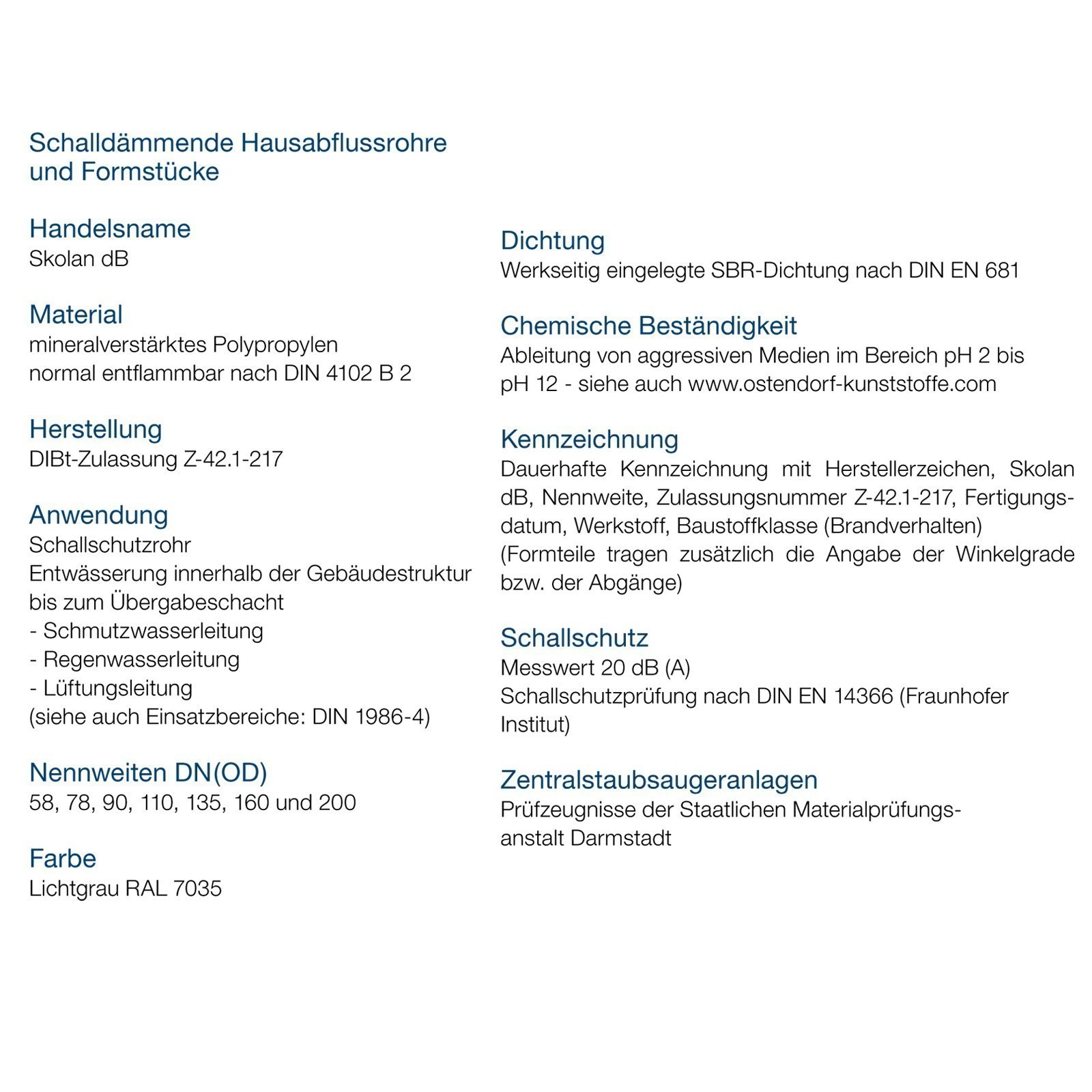 Skolan dB Safe ist ein hochwertiges Kunststoffrohrsystem aus mineralverstärktem Polypropylen. Dieser Werkstoff verleiht dem Schallschutzrohrsystem seine extrem schalldämmenden Eigenschaften und schafft somit ideale Voraussetzungen für den zukunftsweisenden Einsatz in allen Bereichen des Hochbaus (Ein- und Mehrfamilienwohnhäuser, Industriebauten, Krankenhäuser sowie Hotelanlagen etc.). Komplettsystem mit Rohren von DN/OD 58 bis DN/OD 200 sowie einem umfangreichen Formteilprogramm.
