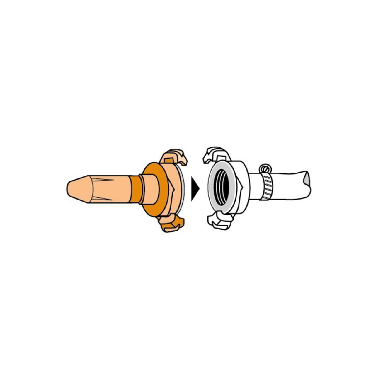 Diese Spritzdüse ist für einen 1/2 Zoll Gartenschlauch geeignet und wird mittels einer GK-Kupplung am Schlauch befestigt.