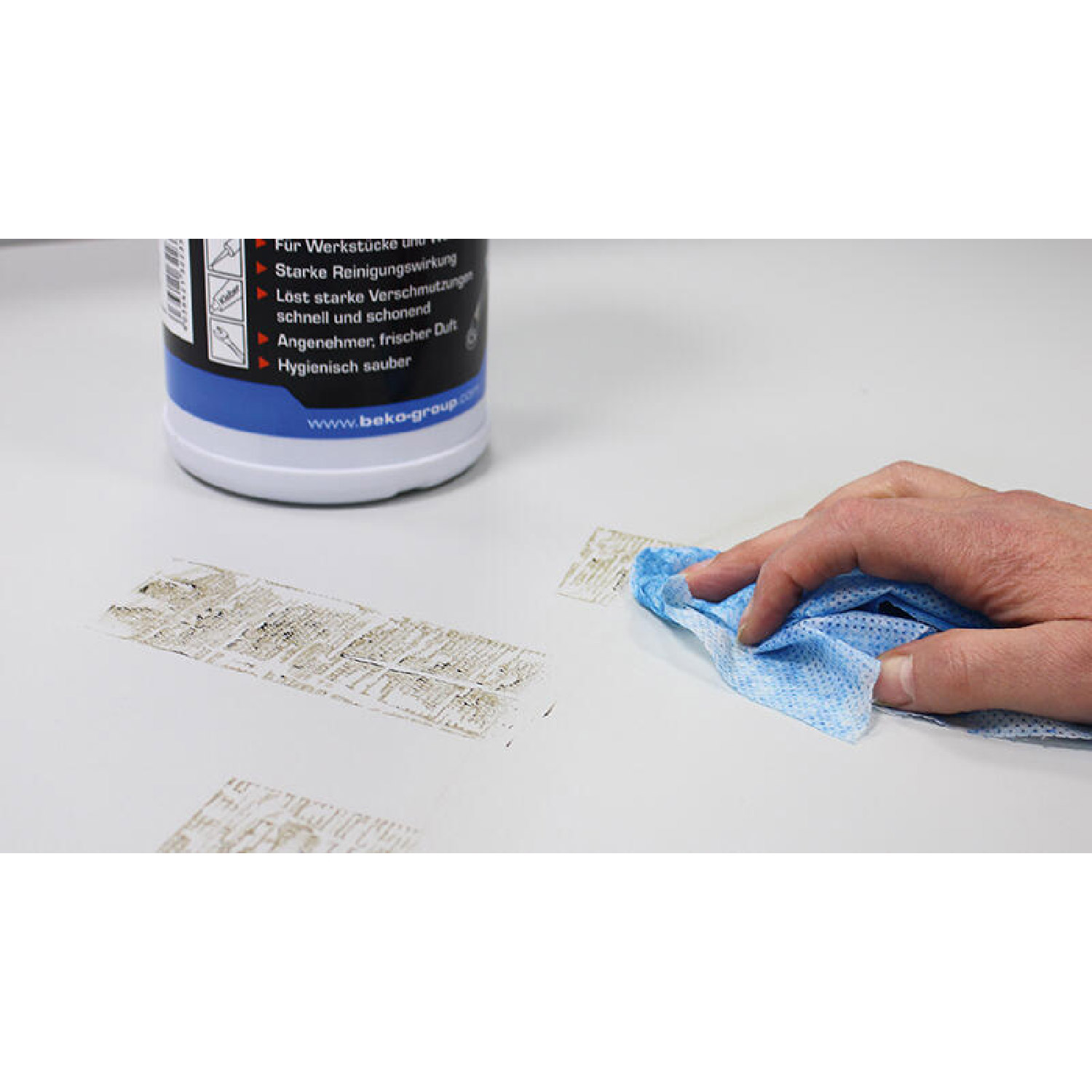 Entfernt grobe Schmutzpartikel, Fett, Teer, Öl, Bitumen, Klebstoff, Dichtstoff, Harz, Wachs, Farbe, Tinte usw. auch in feinsten Rissen und Oberflächenunregelmäßigkeiten. Mobil einsetzbar von Mechanikern, Kundendienstmonteuren, Landwirten, LKW- und Busfahrern usw. Bei Montage- und Außenarbeiten, in Werkstätten sowie bei Wartung, Produktion, Transport und Service.