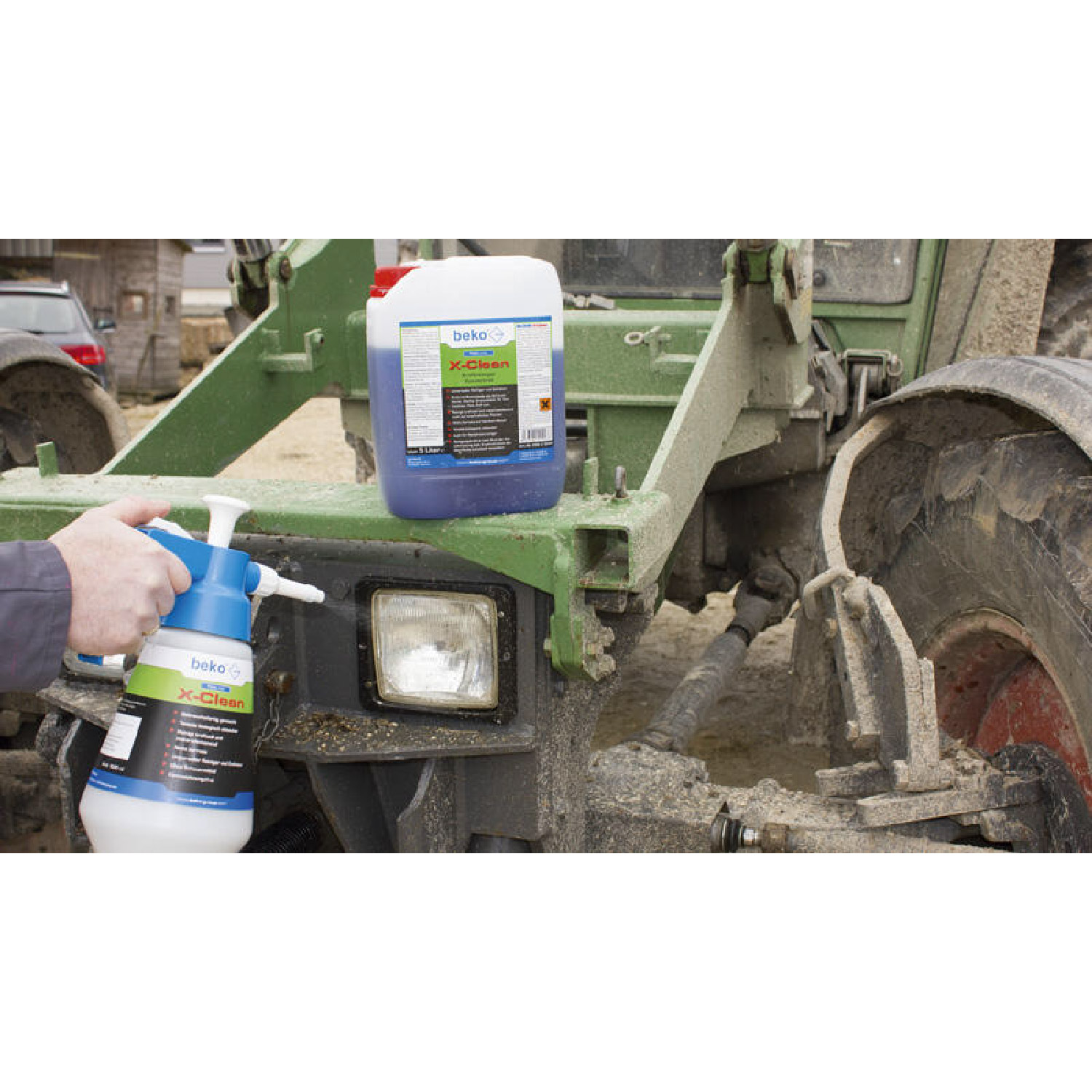beko X-Clean Kraftreiniger gemäß Tabelle auf der Flasche verdünnen und z. B. mit einem Sprüher auftragen. ½ - 5 Minuten einwirken lassen, je nach Grad der Verschmutzung und Beschaffenheit des verschmutzten Materials, anschließend mit einem Tuch abwischen oder mit beko Snow absorbieren. Danach mit reichlich Wasser abspülen. Verträglichkeitstest an verdeckter Stelle durchführen!