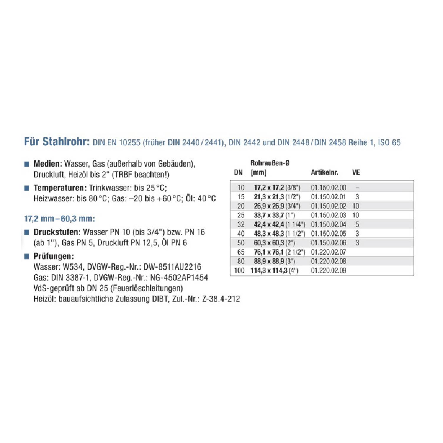 Temperguss-Klemmverbinder für Stahlrohre DIN EN 10255(früher DIN 2440 / 2441), DIN 2442 und DIN 2448 /DIN 2458 Reihe 1, ISO 65
