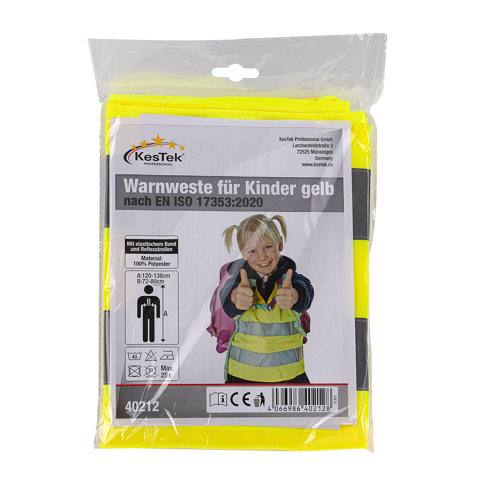 Original KesTek Warnweste für Kinder in gelb. Sie ist nach EN ISO 17353: 2020 (AB3) und EN ISO 13688:2013 + A1:2021 gefertigt und kann überall dort getragen werden, wo Warnschutzkleidung erforderlich ist. Sie soll den Träger bei schlechtem Wetter sichtbar machen und von der Umgebung abheben. Sie erhöht die Sichtbarkeit während des Tages (durch Verwendung von fluoreszierendem Material) und (durch retro-reflektierendes Material) bei Verwendung von Licht im Dunkeln. Orte, an denen eine Person gut sichtbar sein sollte, sind Autobahnen, Eisenbahnen, Schulwege usw.